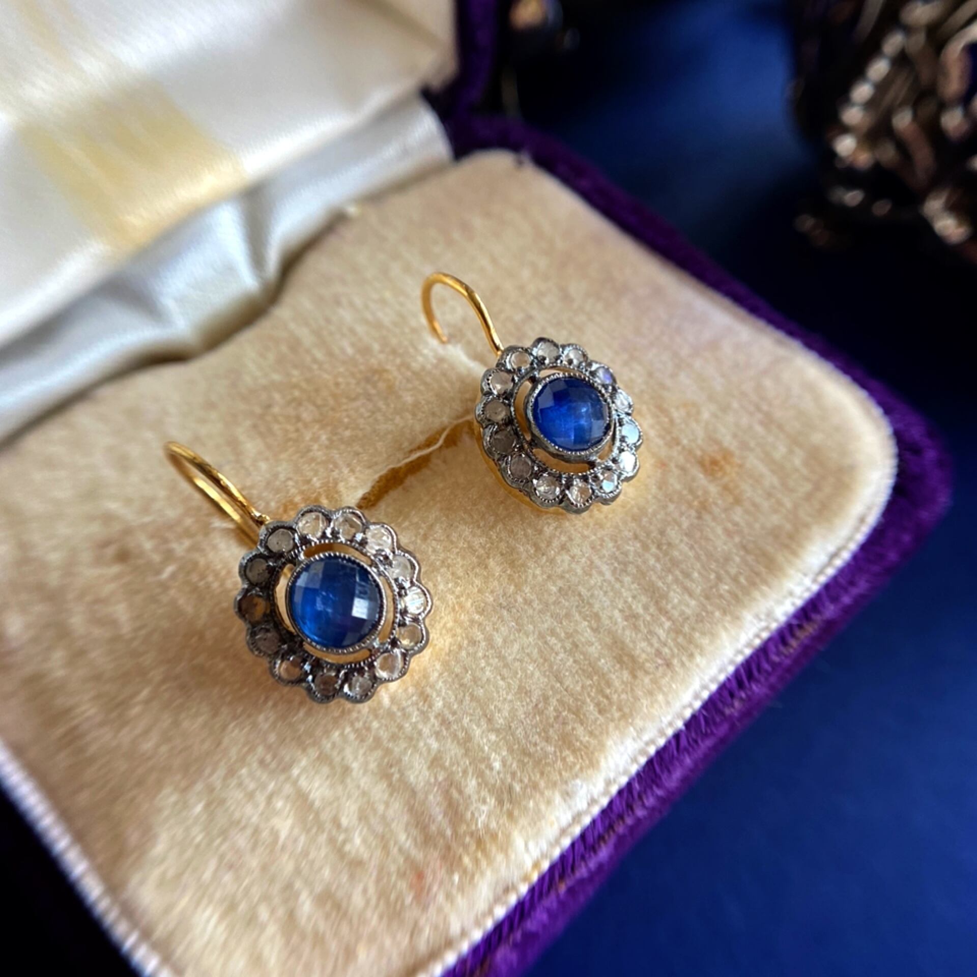 ローズカットサファイア&ダイヤモンドクラスターヴィクトリアンピアス