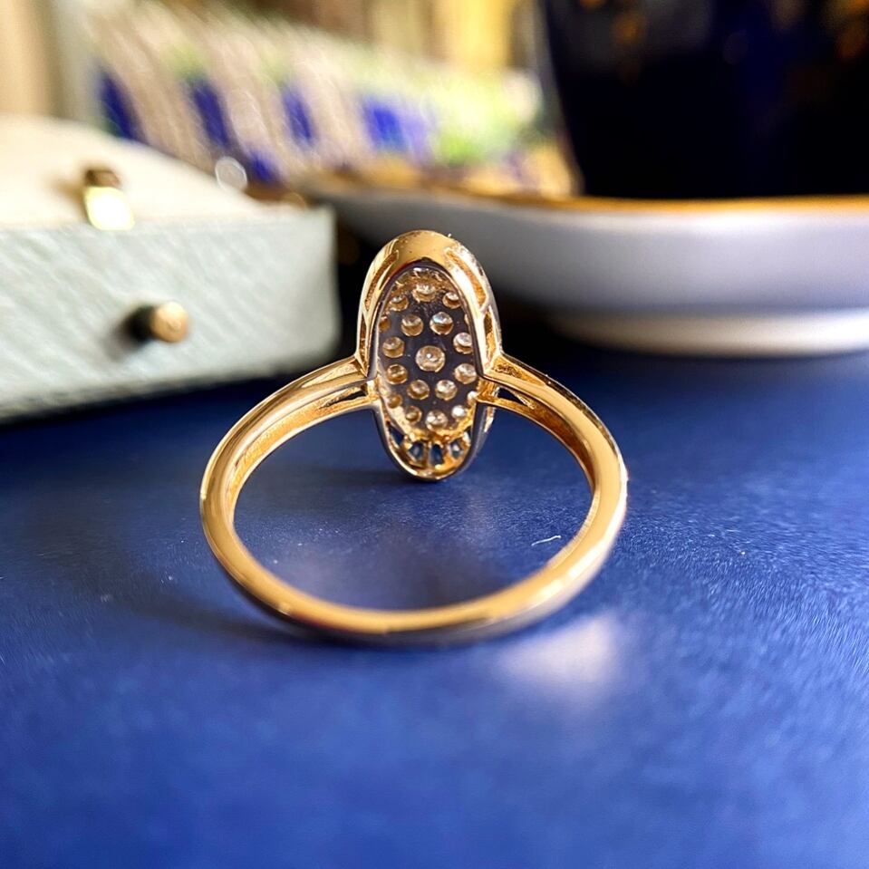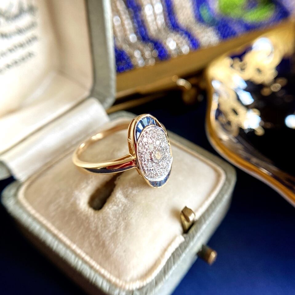 扇型の枠に面取りしたサファイアをその型に合わせてカットし、カリブレセッティングで5石づつ隙間なくセットしているのですが、アールデコ期のリングはシンプルでモダンでスタイリッシュにも関わらず、計り知れない職人さんの技術が詰まっていて、つくづく感心してしまうのです。