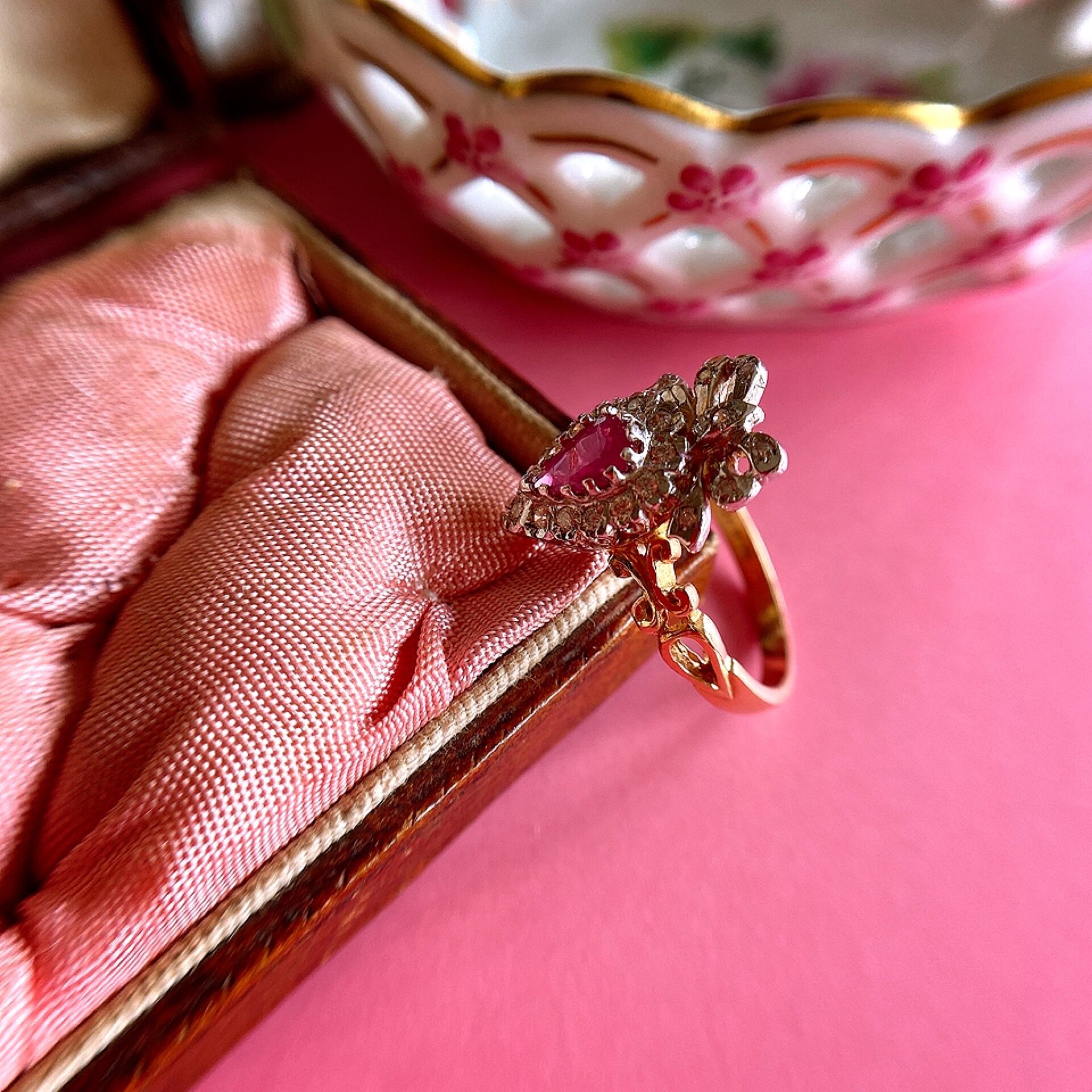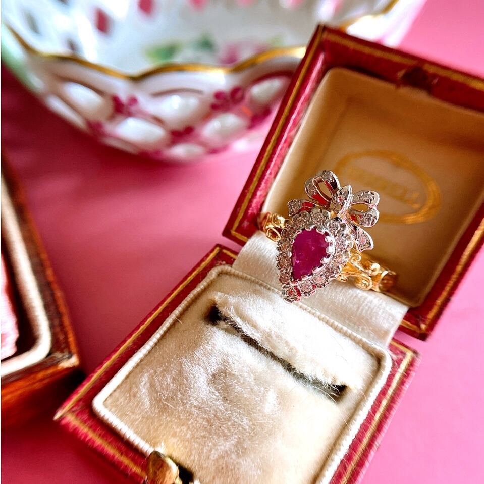薔薇の花弁のようなローズピンク色のルビーをペアシェイプ型の台座にセッティングして、その上にはリボンをキュッと添えた何とも愛らしいリング。