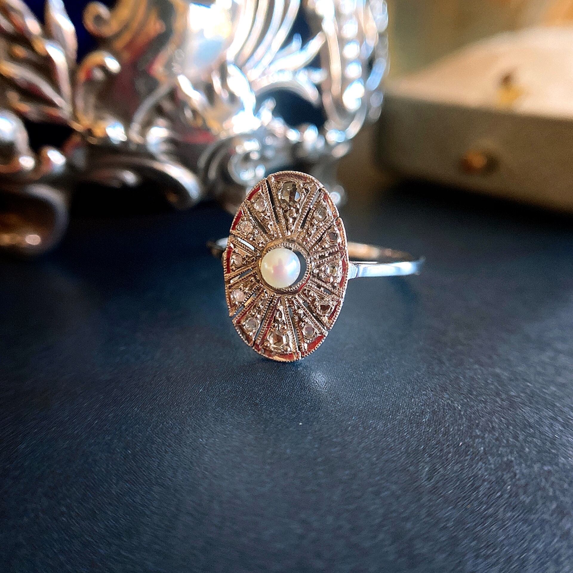 中心の小さな小さなパールも絶妙で、 白いシルキーな光沢は柔らかく周りのダイヤモンドと相まって心地よい対比を魅せてくれるひと品です。