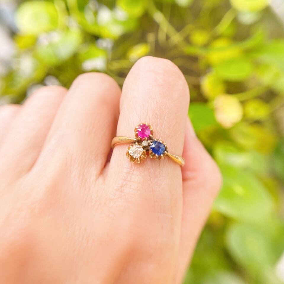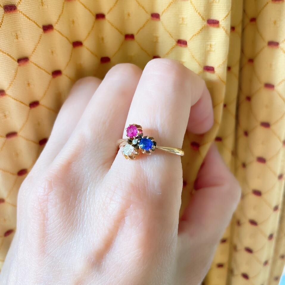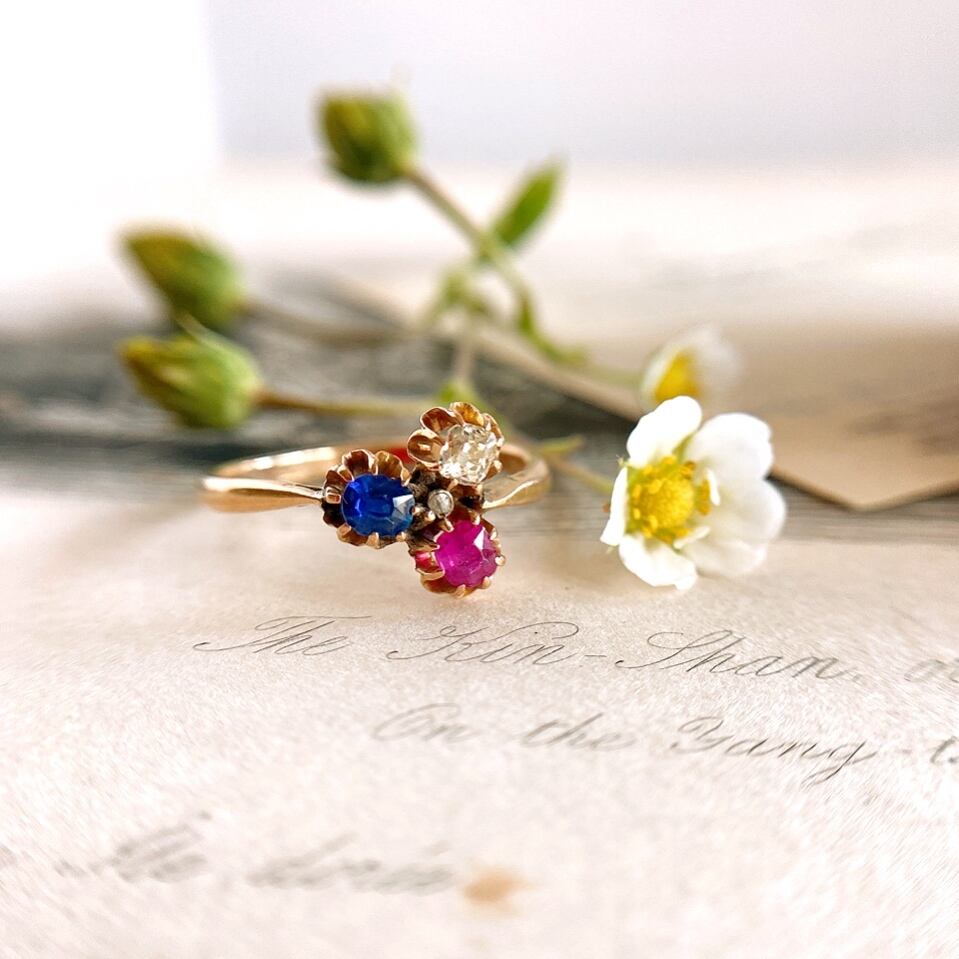 一つ一つは小さな存在かもしれないけれど、3石が集まると、なんて華やかな三つ葉だこと。心までも弾んでしまう、可愛らしく、でも大人っぽくもあるリングです。