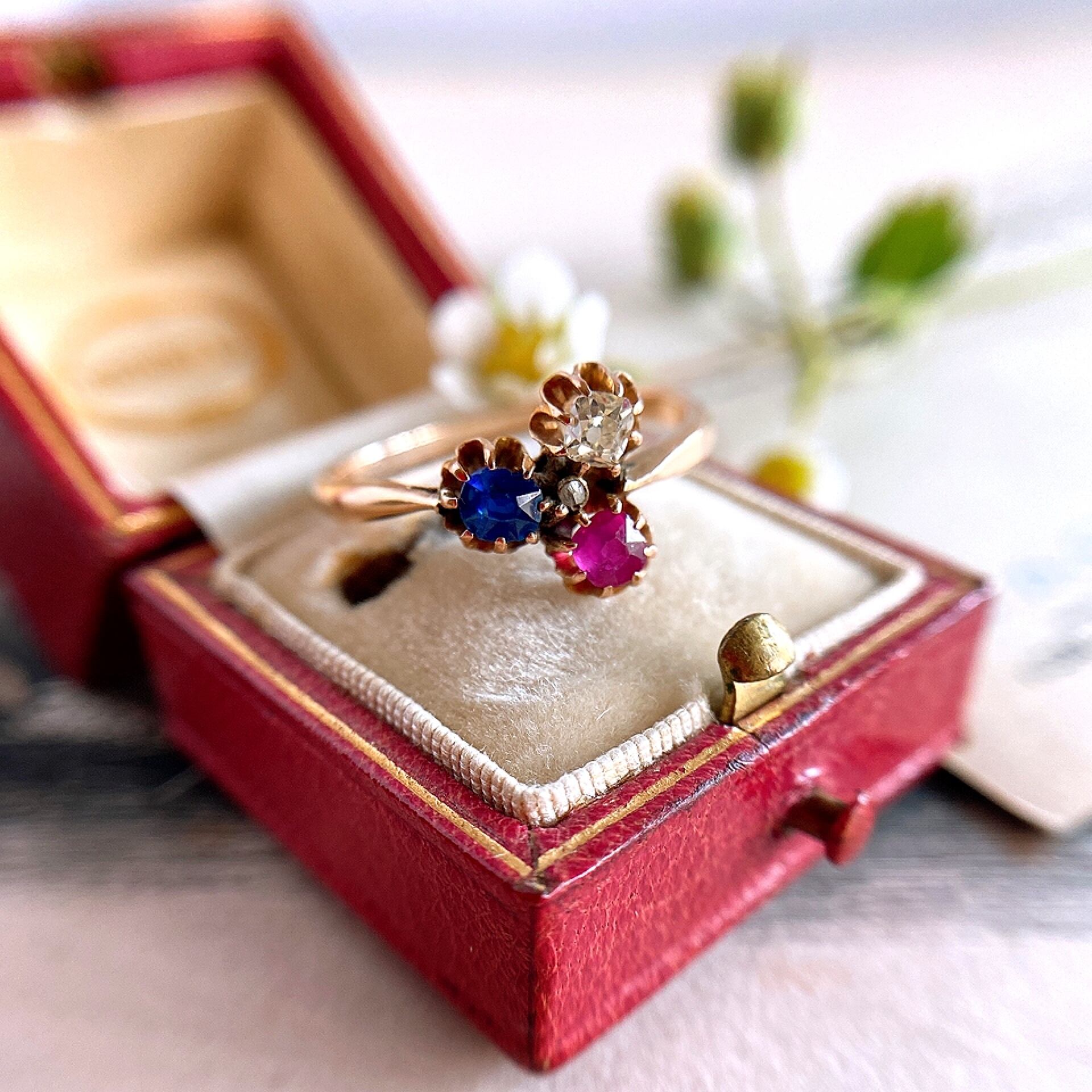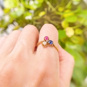 それぞれ3.2mm程のルビー、サファイア、ダイヤモンドを葉に見立て、咲いたばかりの生き生きとした三つ葉のクローバーを表現したリング。