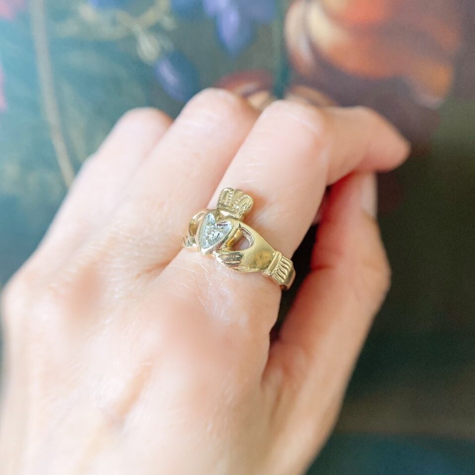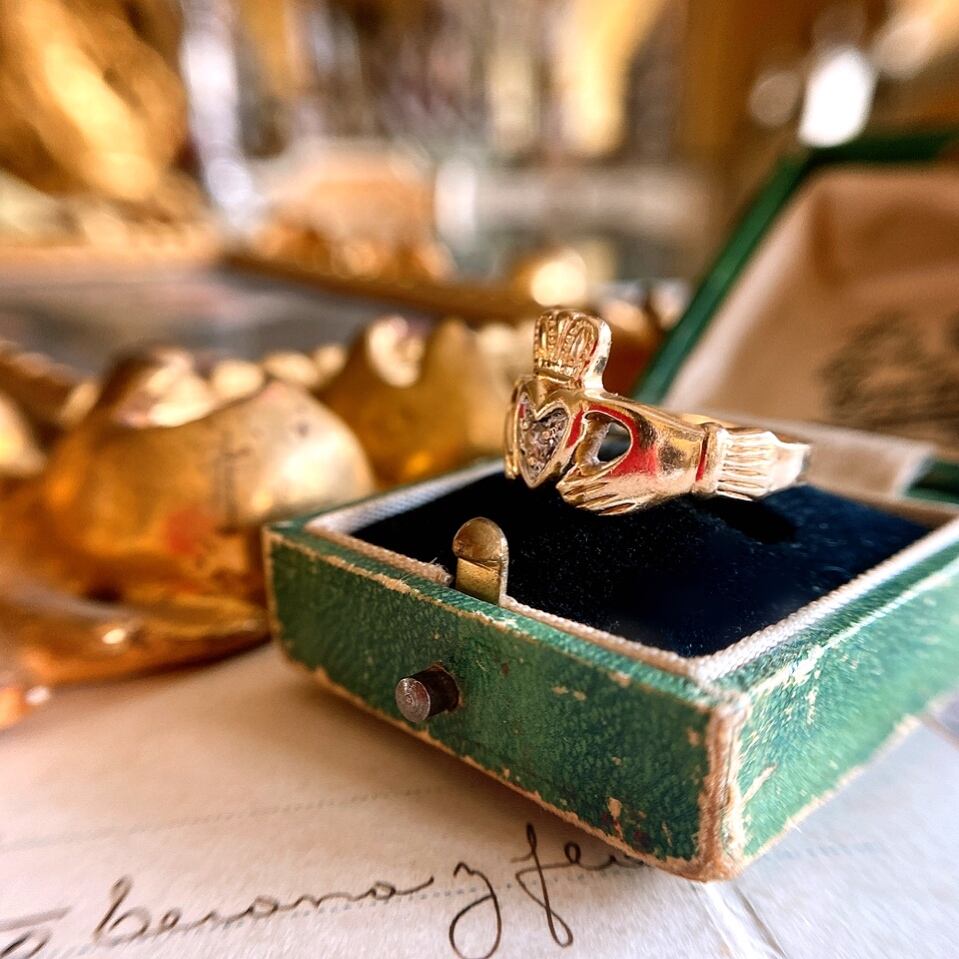 お馴染みの2つの手でハートと王冠を支えるアイルランドの伝統的なデザインであるクラダリング。