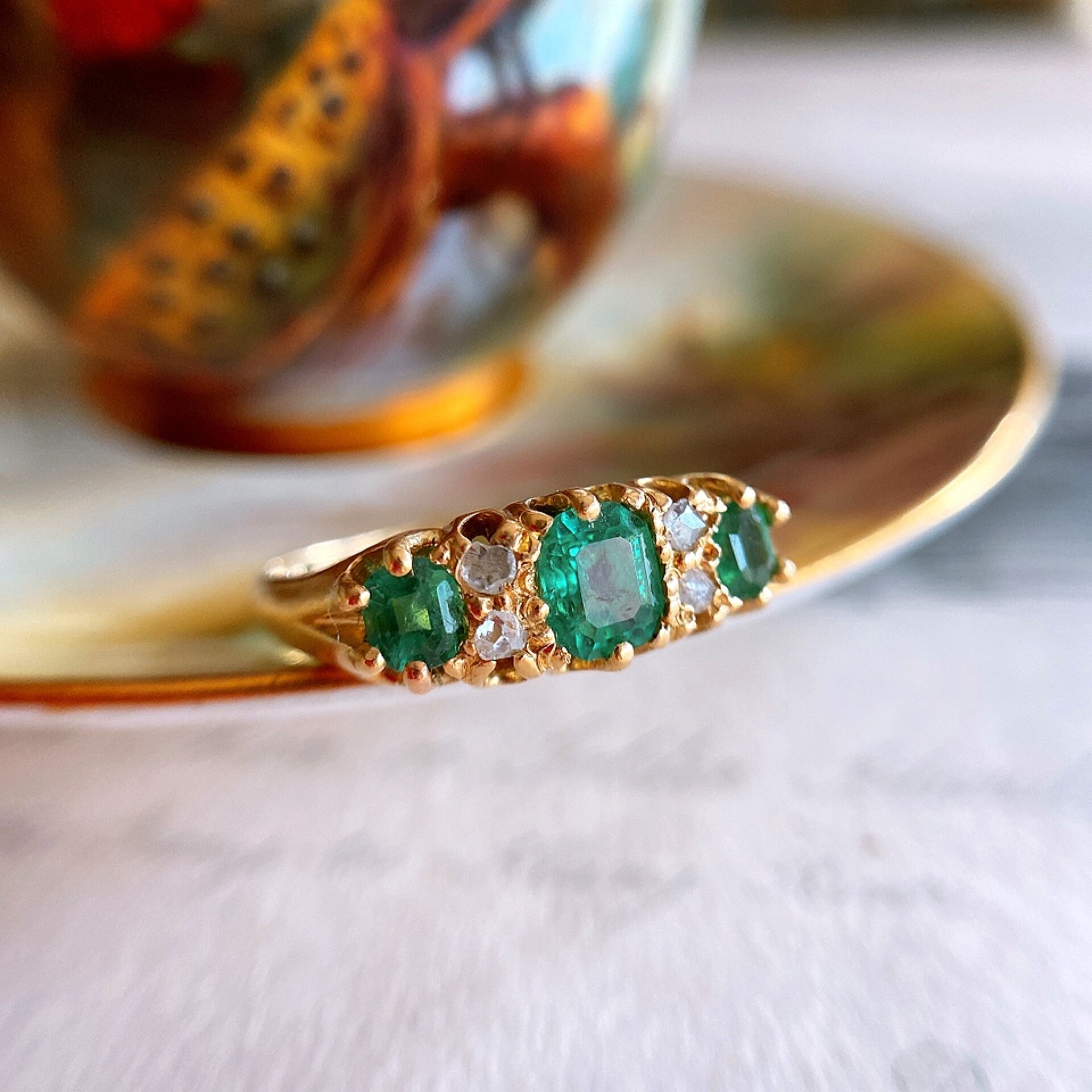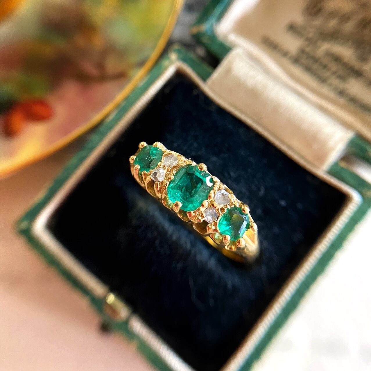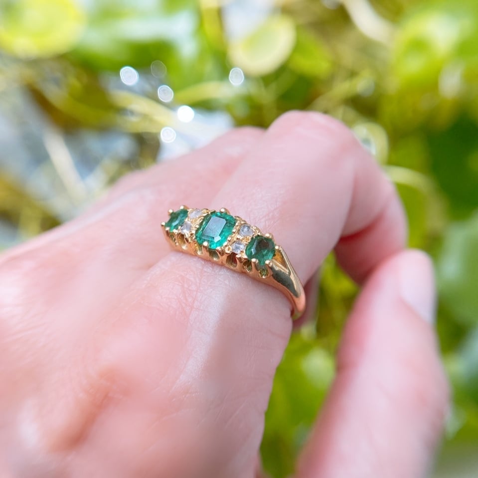 3粒の爽やかな発色のエメラルドの合間を埋めるように小さな4粒のローズカットダイヤモンドを飾った華やかなリング。