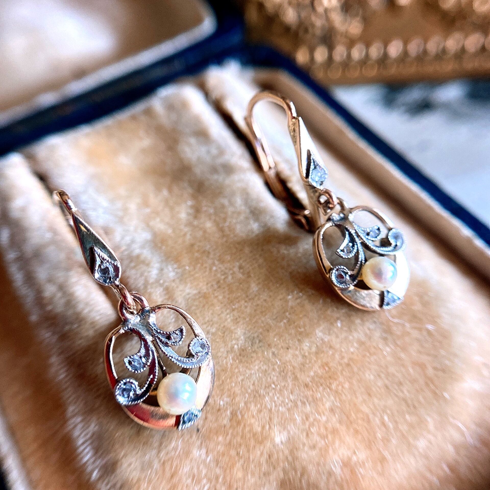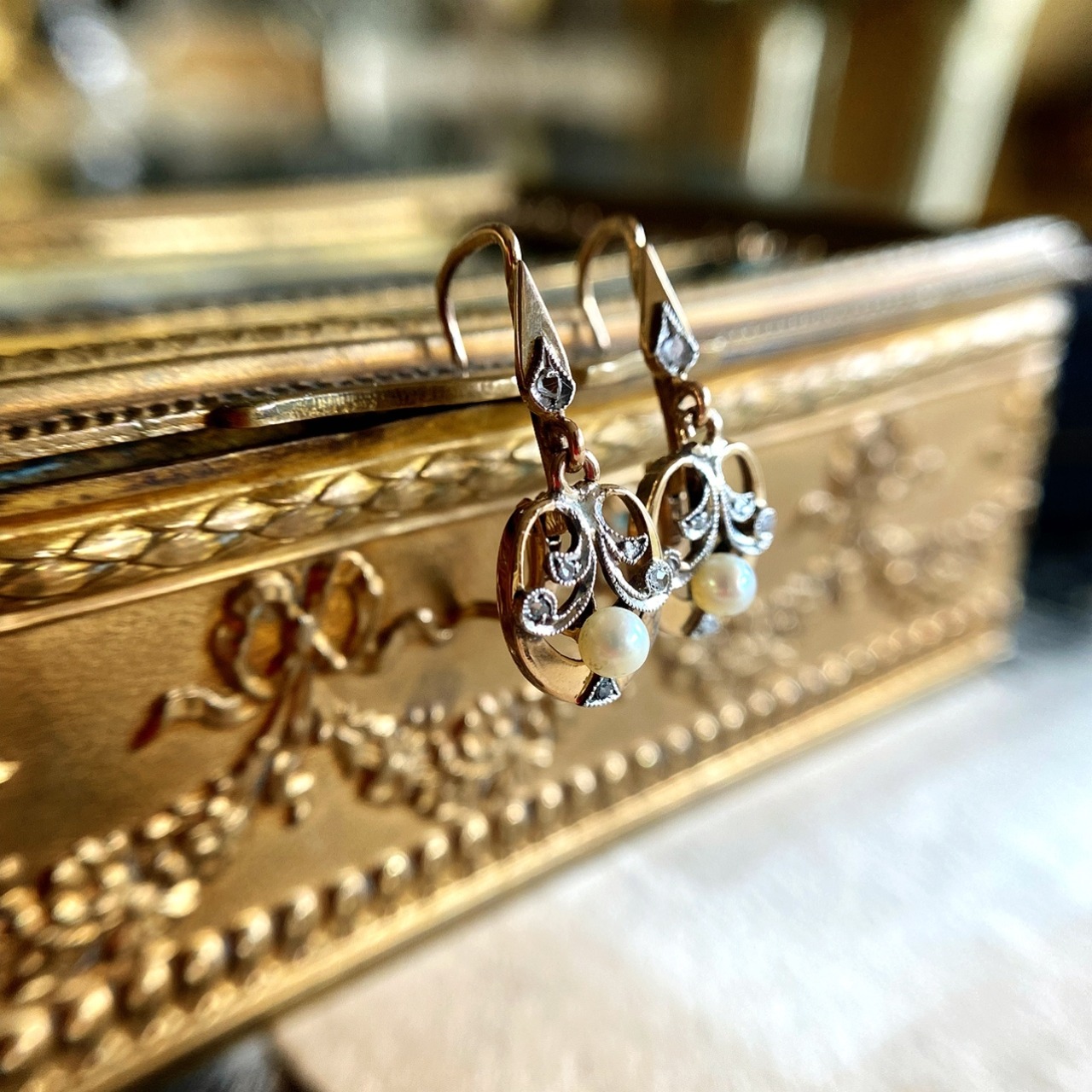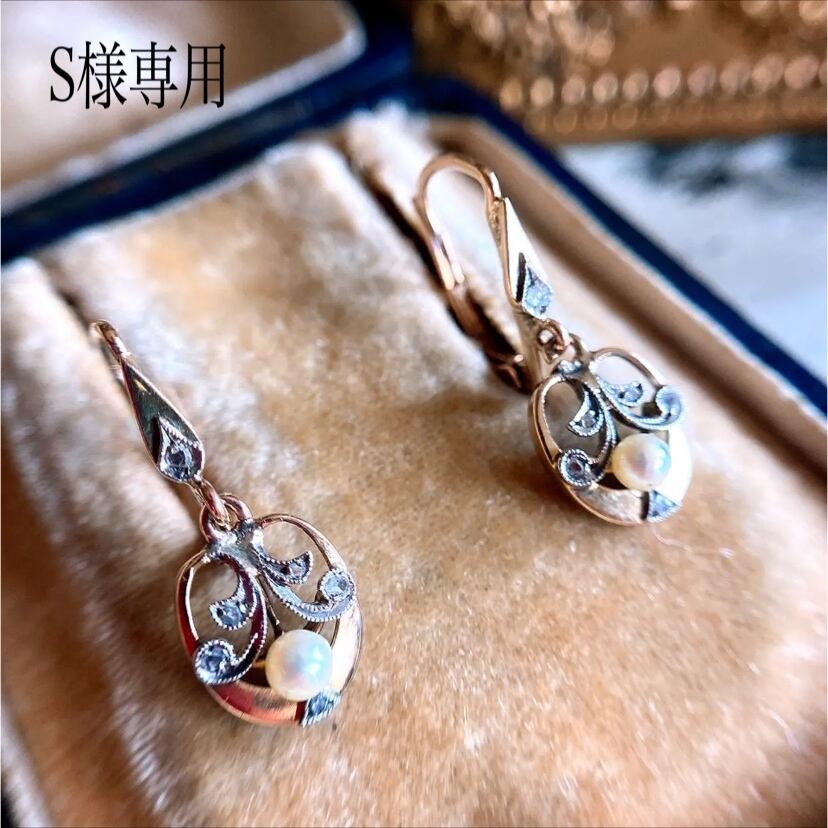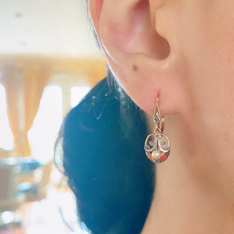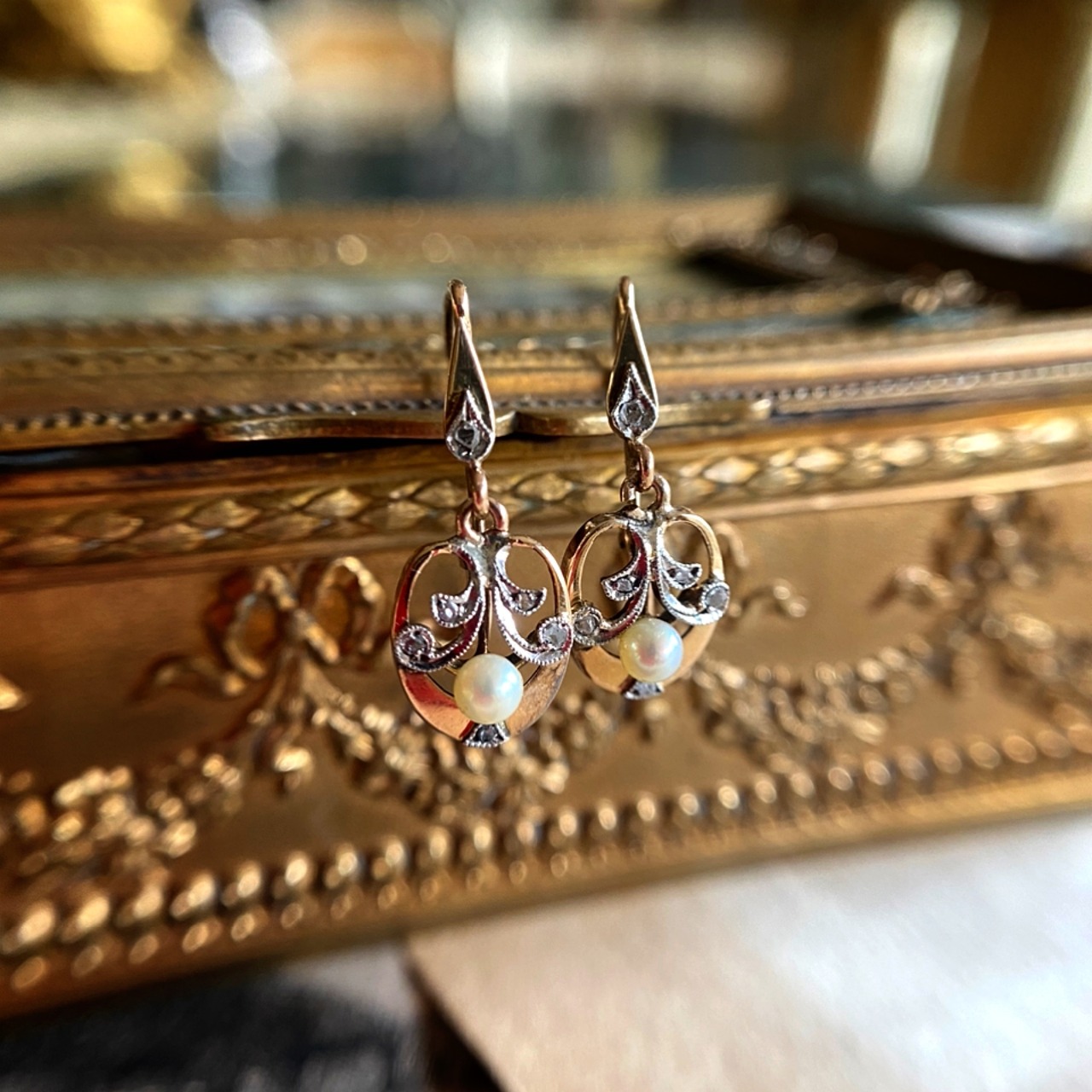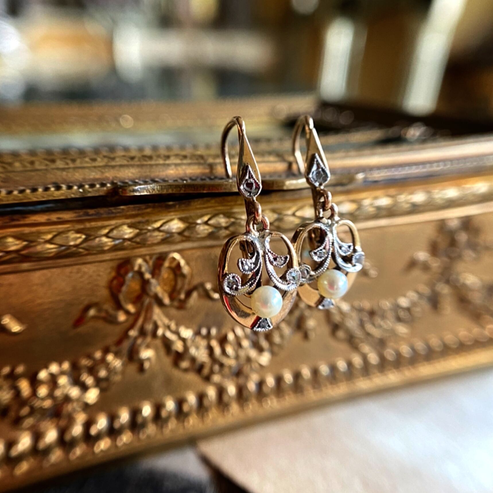 宿り木をモチーフとしたジュエリーが流行した1900年頃のピアスらしい繊細さを感じるひと品です。
