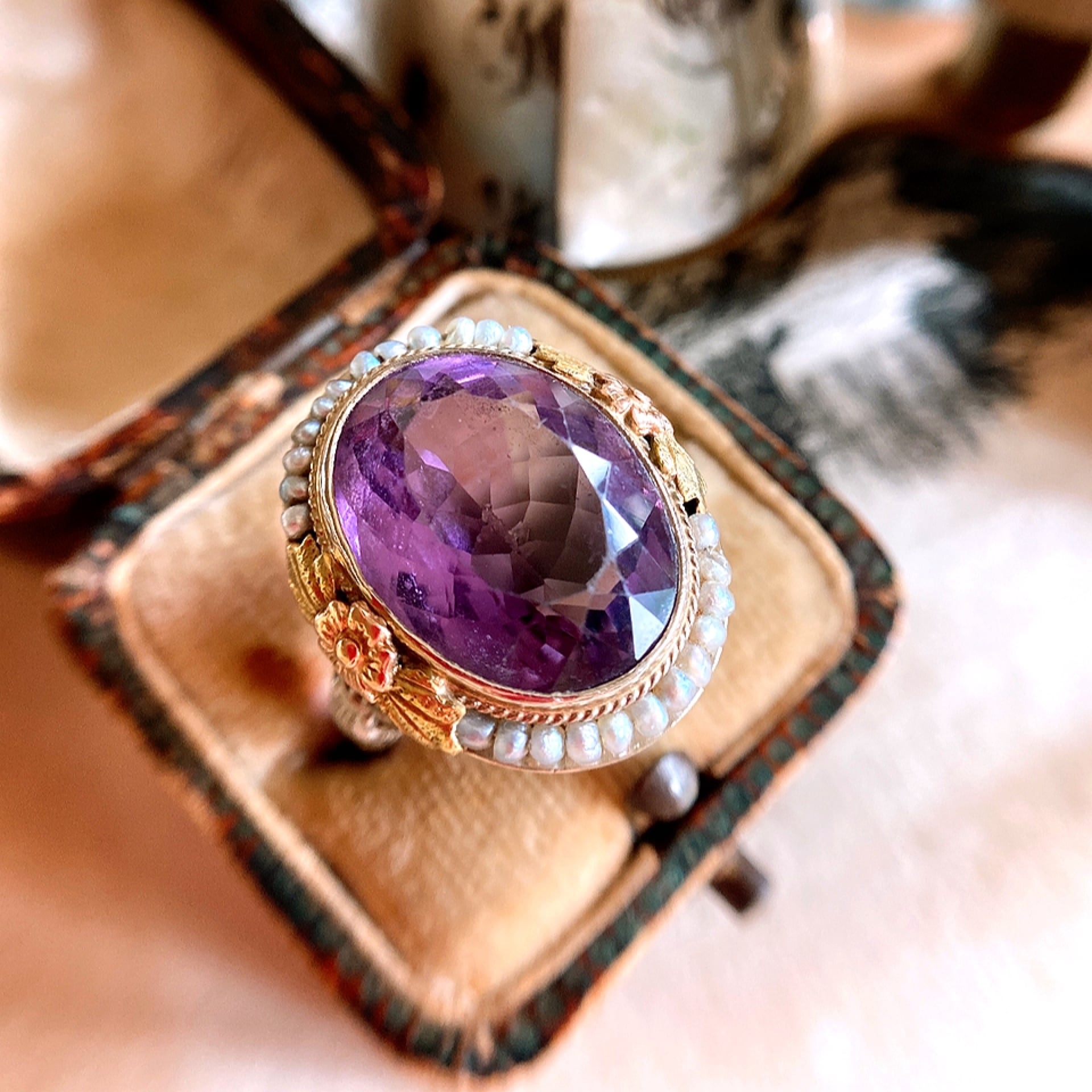 アメシストが小さな小さなシードパールを幾つも繋いだ美しいフレームに収まったなんともデコラティブな