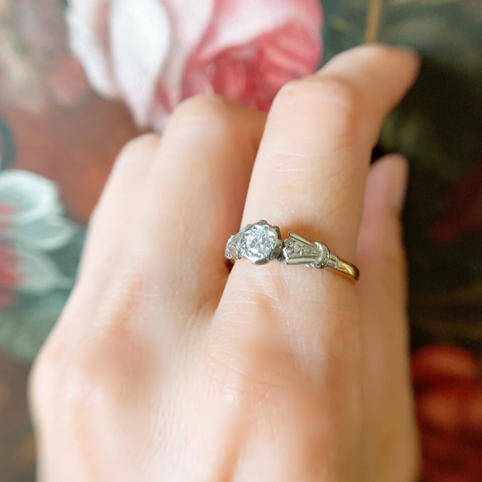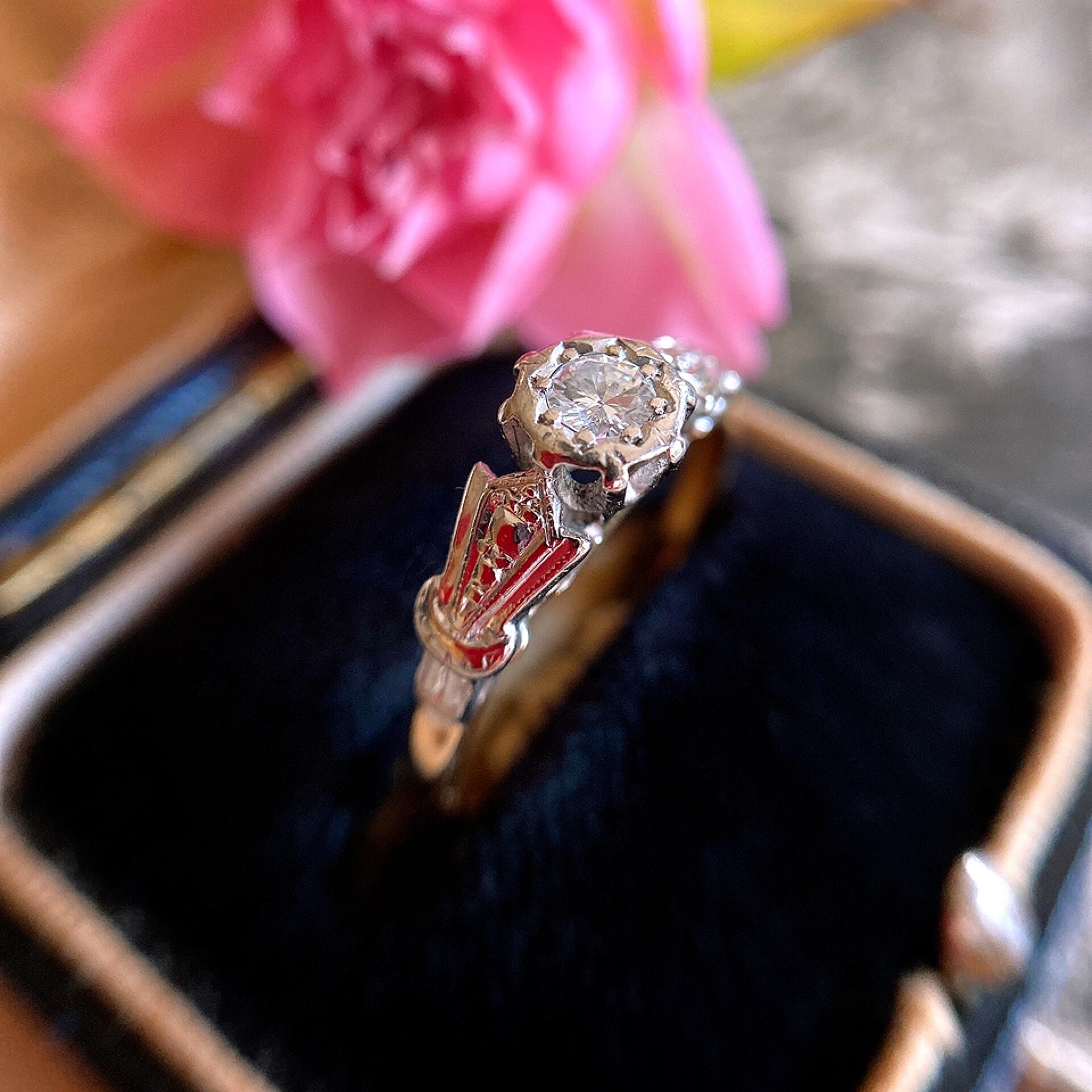 こういう個性的なデザインのダイヤモンドソリテールリングってそう簡単には見つかりません。ソリテールはシンプルなデザインの物が多くありますが、こうしたデザインの凝った物は比較的少ないのです。
