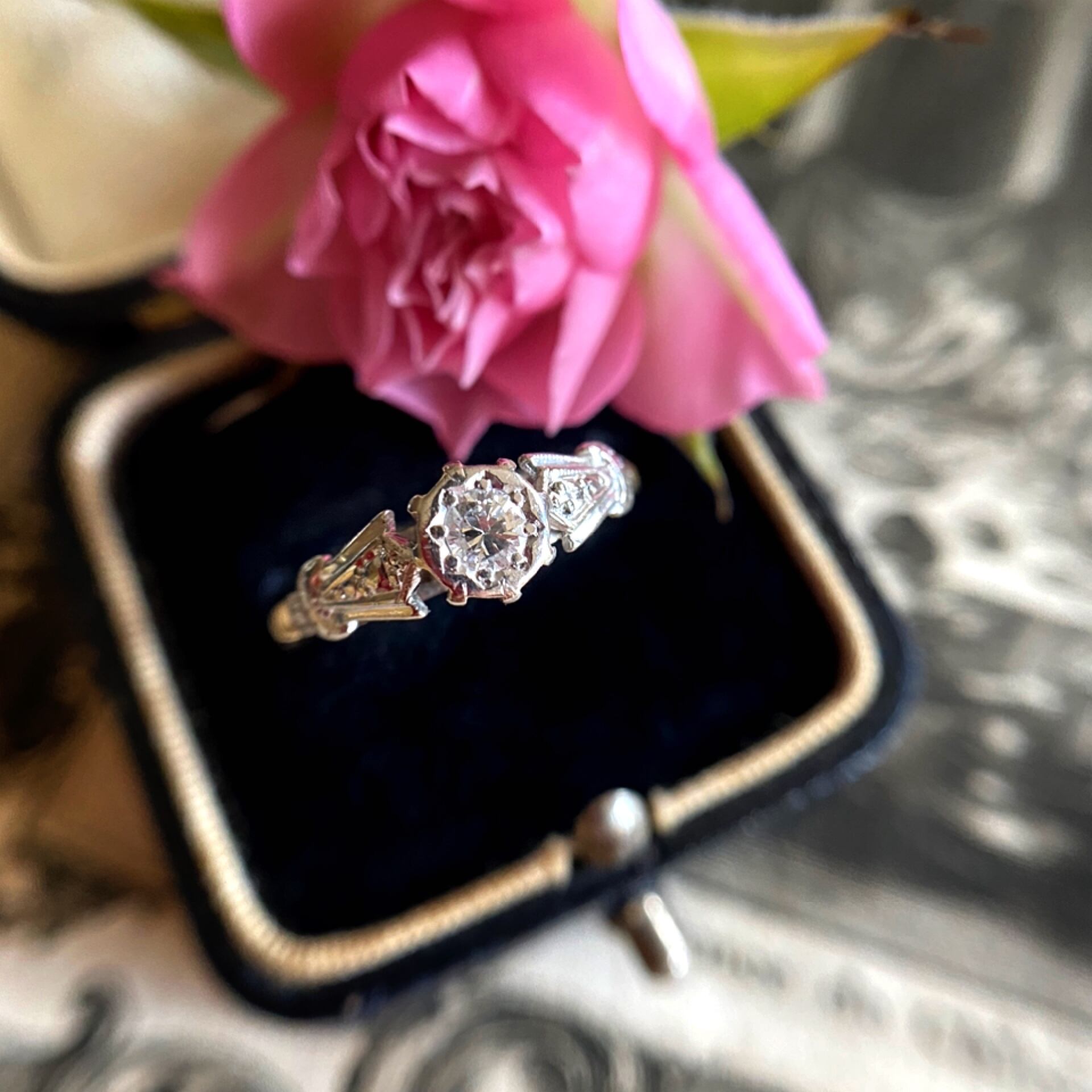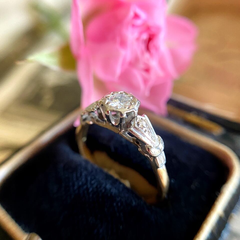 星の輝きを表現したかのような8つにのびる光線を彫金したプラチナの台座の中にすっぽりとひとかけらの星のようにオールドヨーロピアンカットダイヤモンドをセットした美しいアールデコのソリテールリング。
