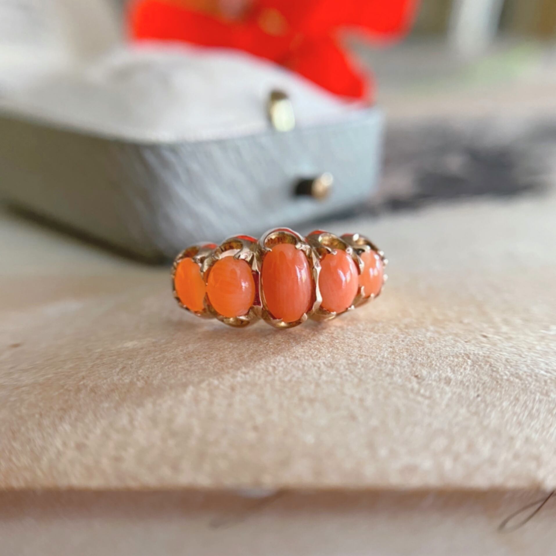 そんな珊瑚だけを5つ、カボションオーバルカットにして、シンプルにセットしたリングは、程よいサイズ感で、日常使いもしやすく、目立つ傷やカケなどもなく残ってきた事も魅力です。