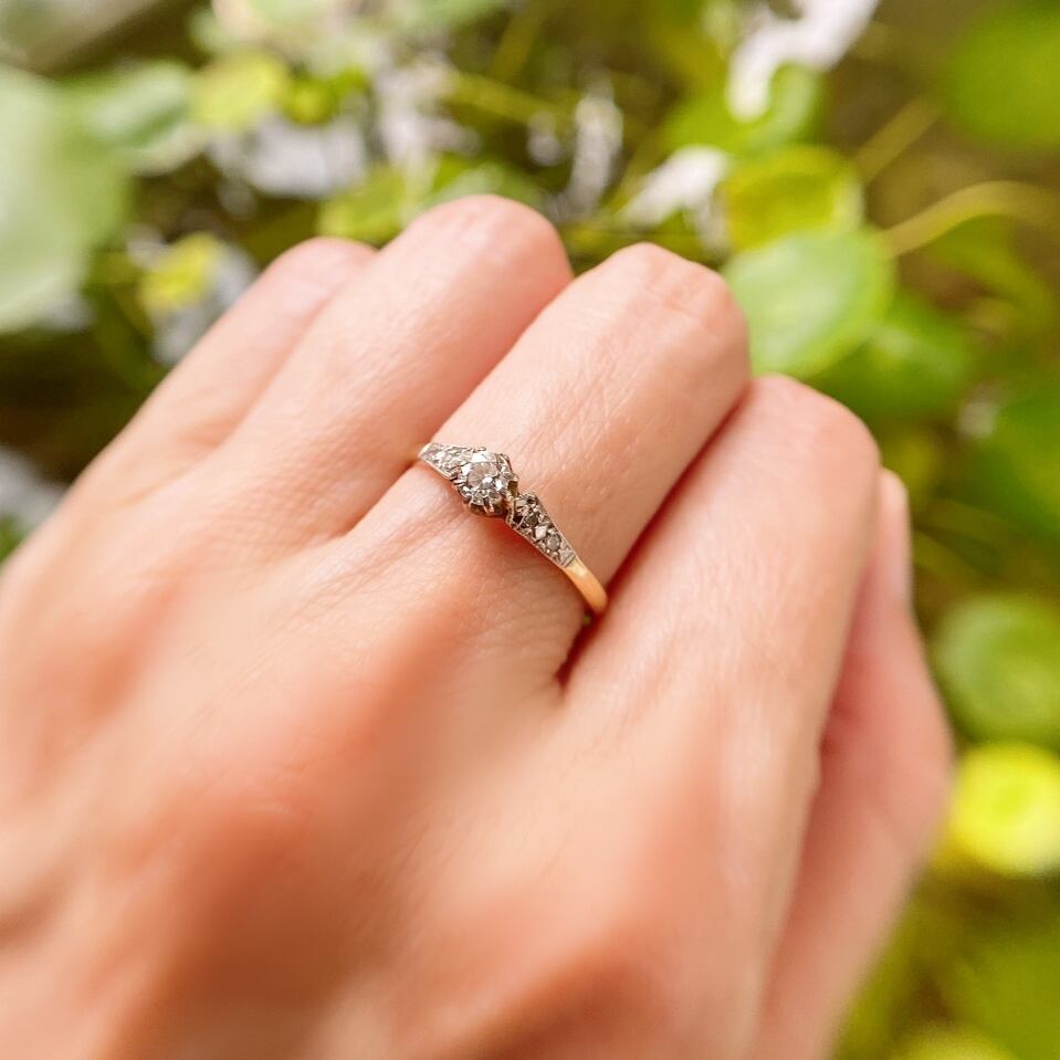 角の立ったシャープなアウトラインのショルダーに支えられるようにして小さな小さなオールドヨーロピアンカットダイヤが高くセットされたスタイリッシュなソリテールリング。