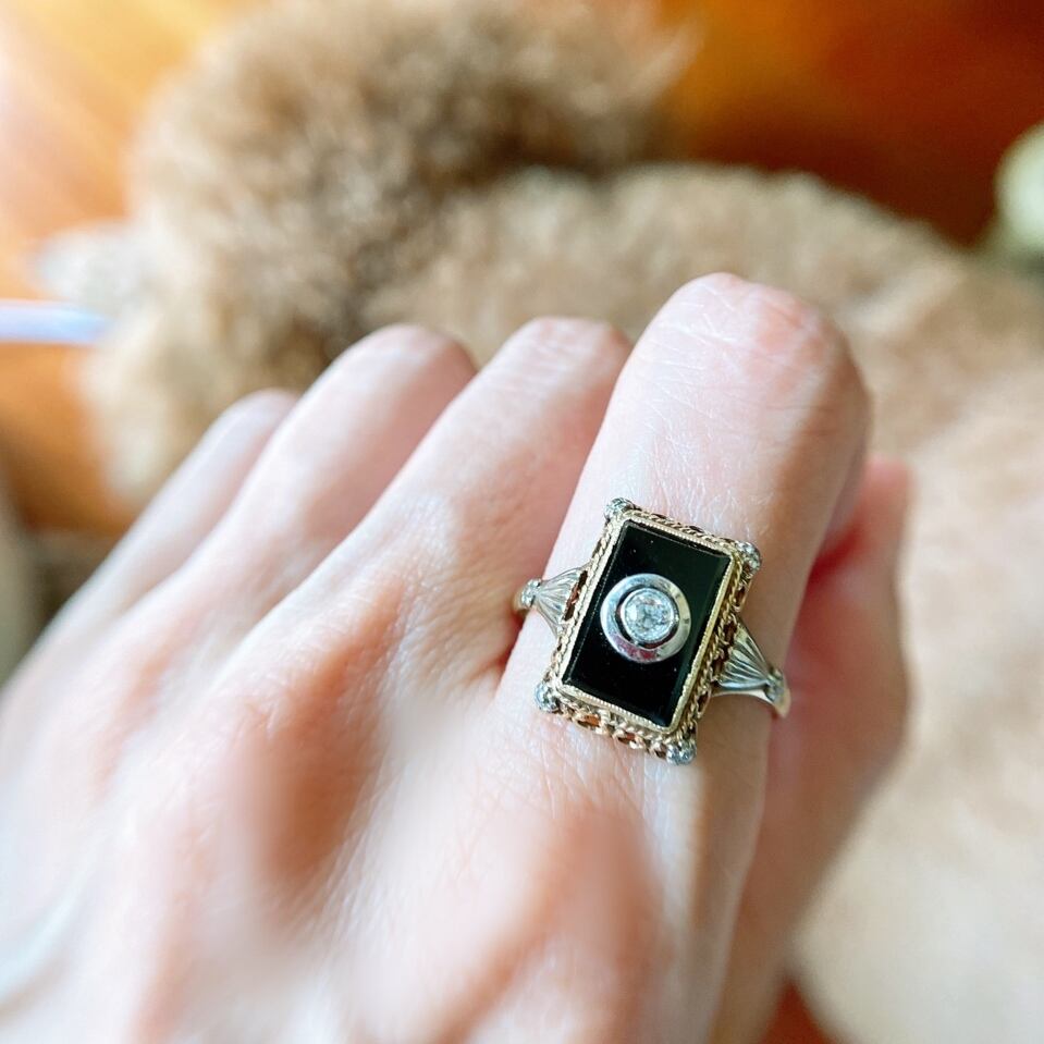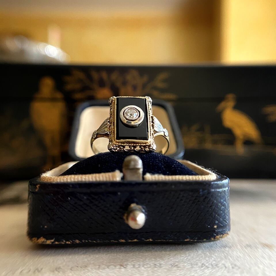 磨き上げられた真っ黒なブラックオニキスとダイヤモンドが対比となり際立った美しい姿をしたアールデコリングのご紹介です。