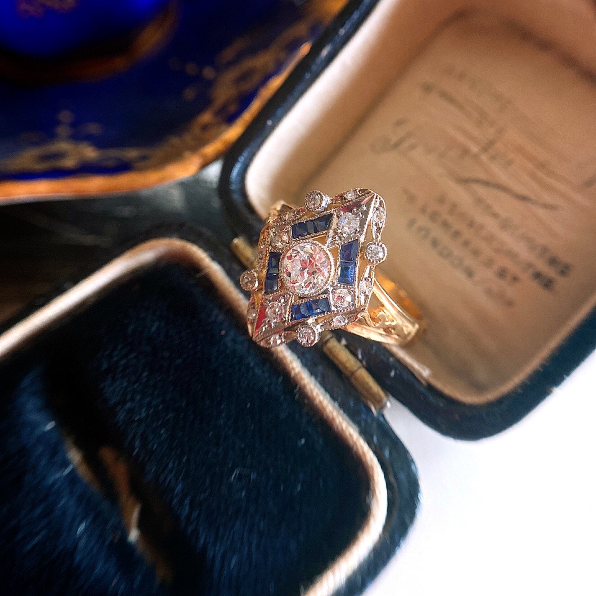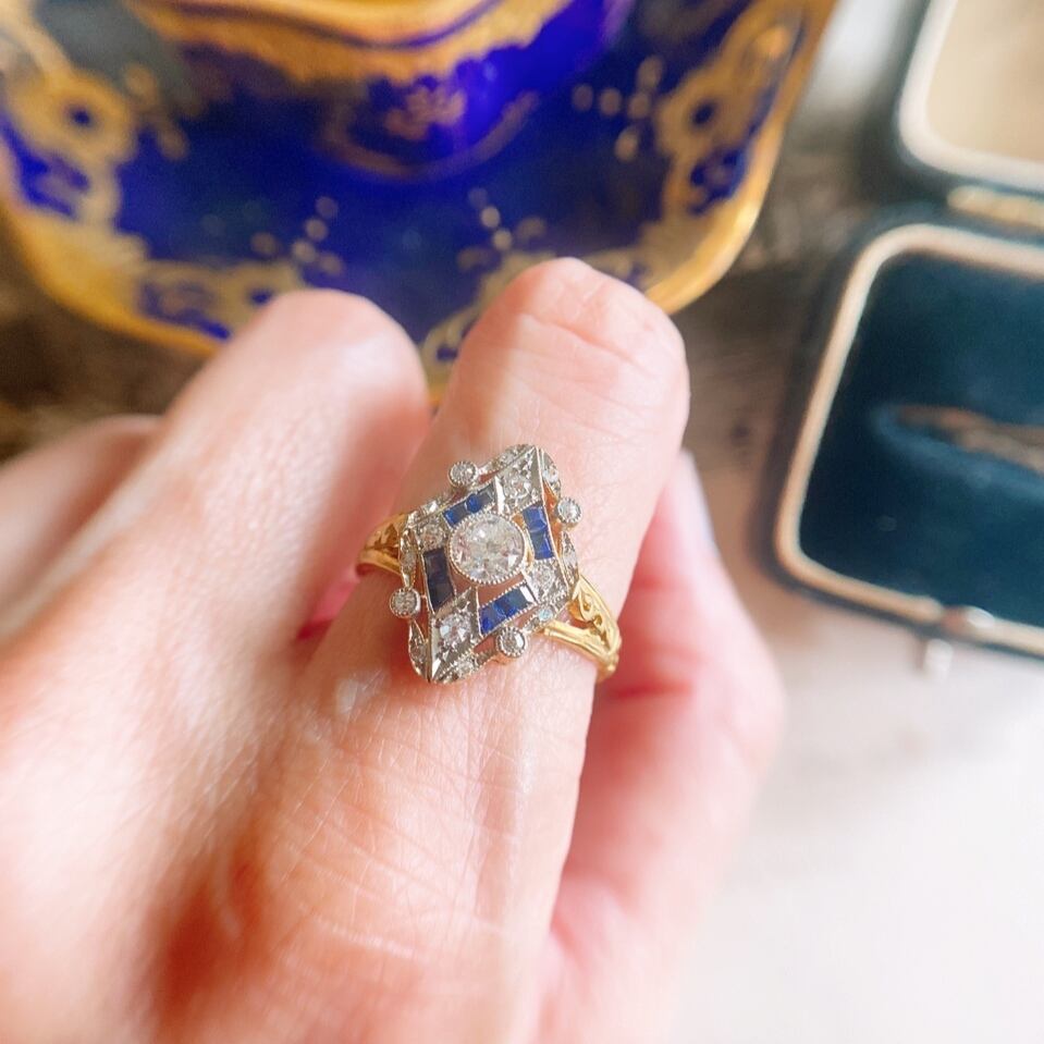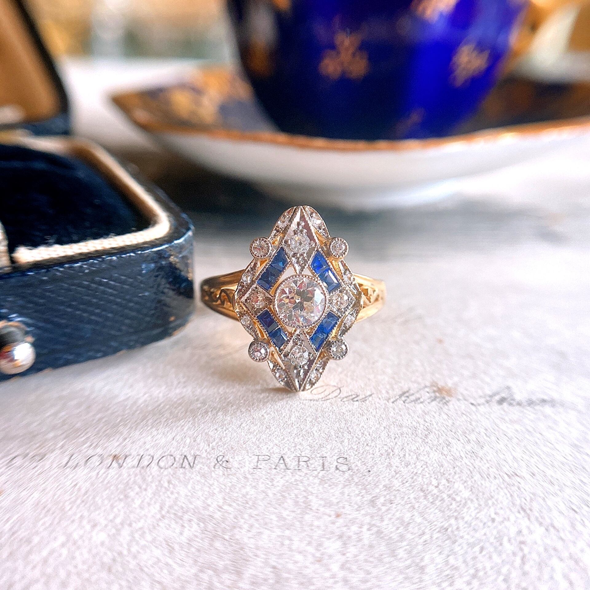オールドヨーロピアンカットダイヤモンド&カリブレカットサファイアデコラティブリング