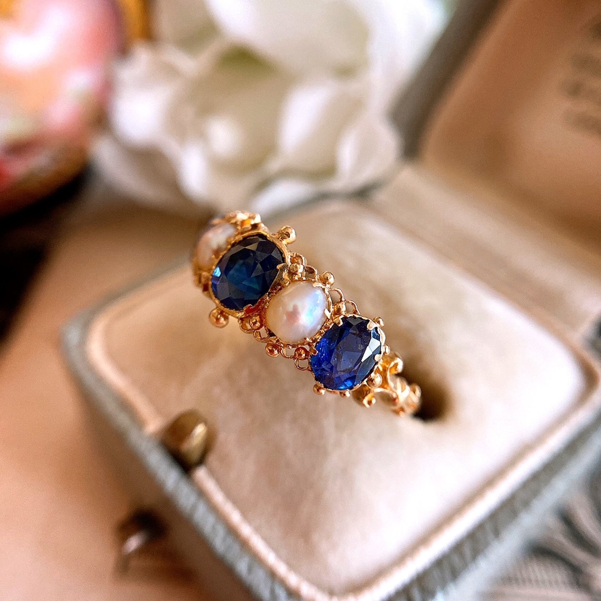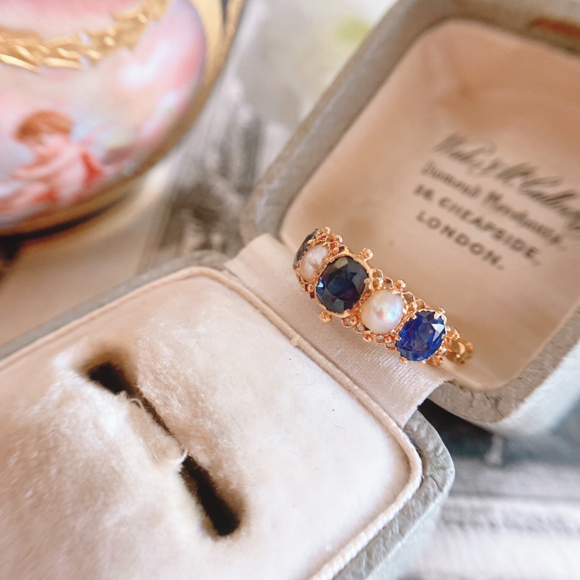 天然サファイア&パールファイブストーンヴィクトリアンリング