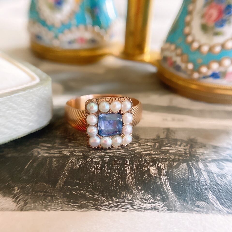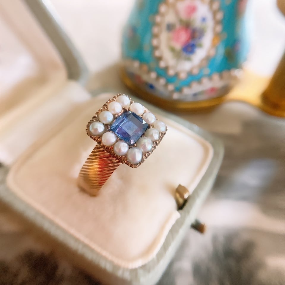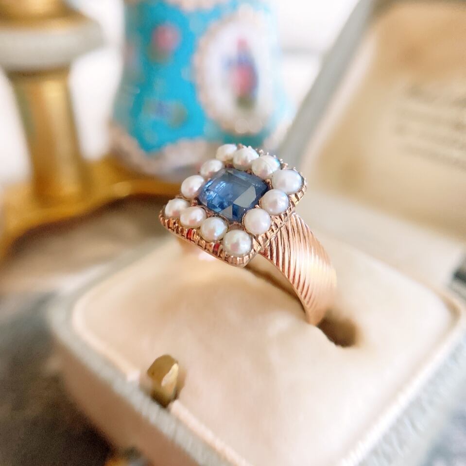 純粋なクリアアクアブルーとでもいいましょうか、混じり気のない透明感のあるサファイアはジョージアン特有のクローズドセッティングで収められ、周りには純白のナチュラルパールがセットされています。