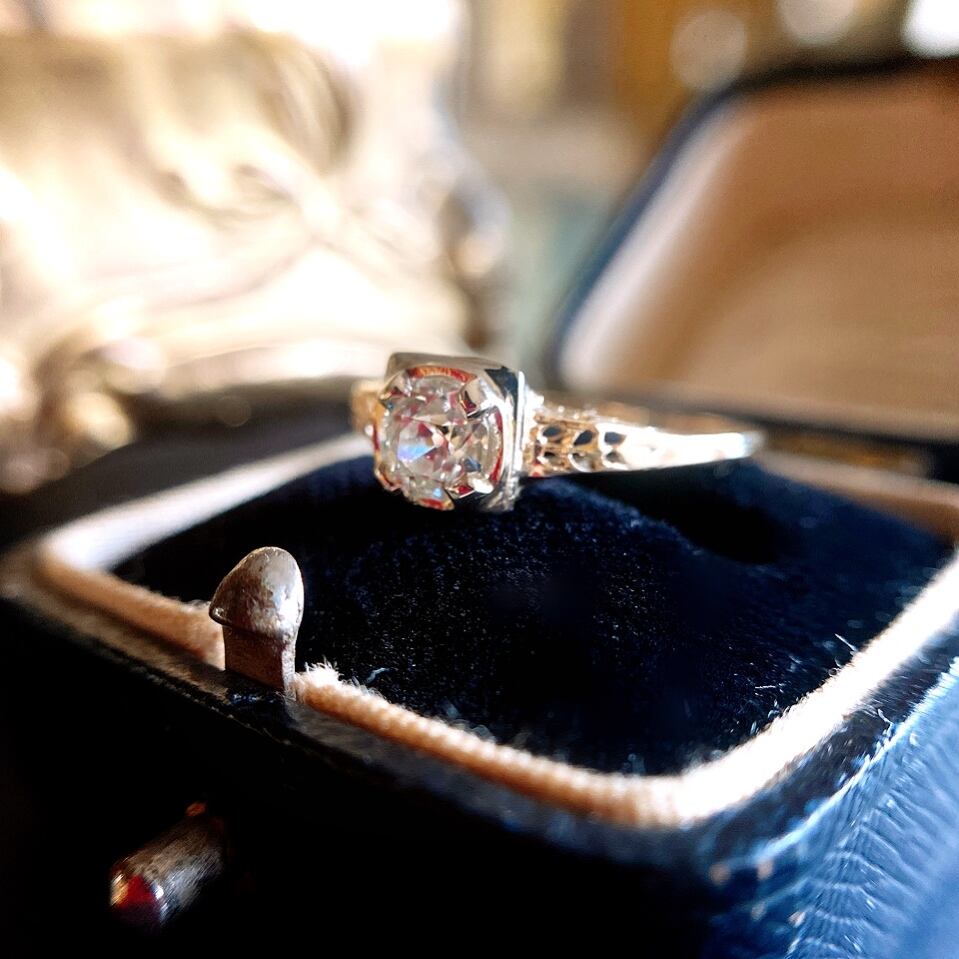正方形のスッキリとしたフェイスにセットされた丸いオールドヨーロピアンカットダイヤモンドはまるで満月の静寂な夜空を表現しているような、アンティークダイヤモンドならではの奥行ある煌めきが素敵なソリテールリングです。