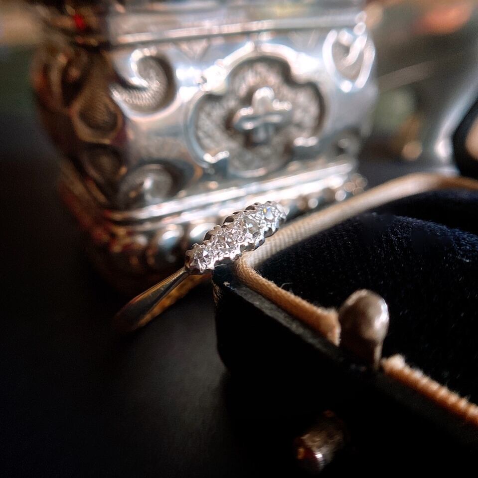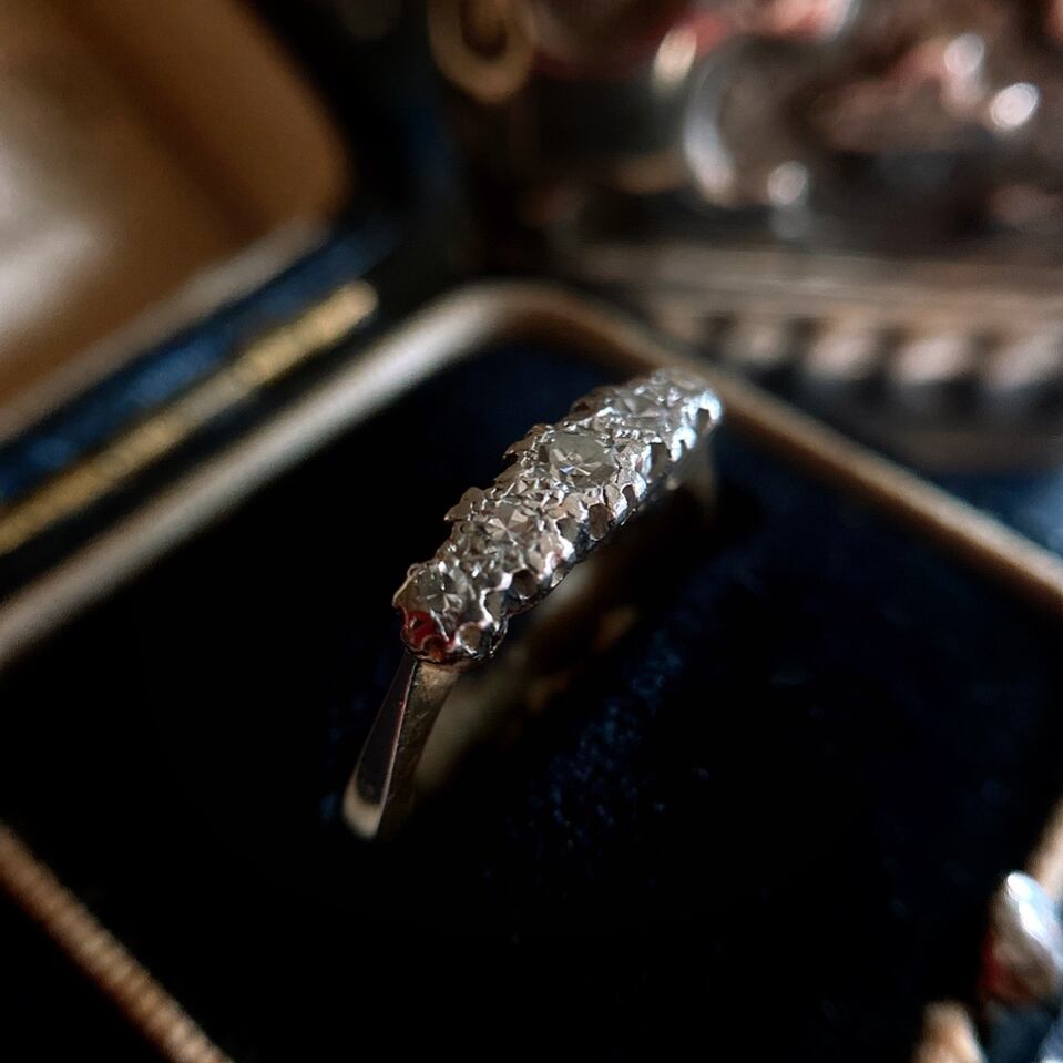 小さなお花型にデザインされたプラチナの台座に星屑のようなシングルカットダイヤモンドが一列に連なる一文字リング。小さいながらもそれぞれが光を不規則に反射して、アンティークならではの柔らかな光を見せてくれます。