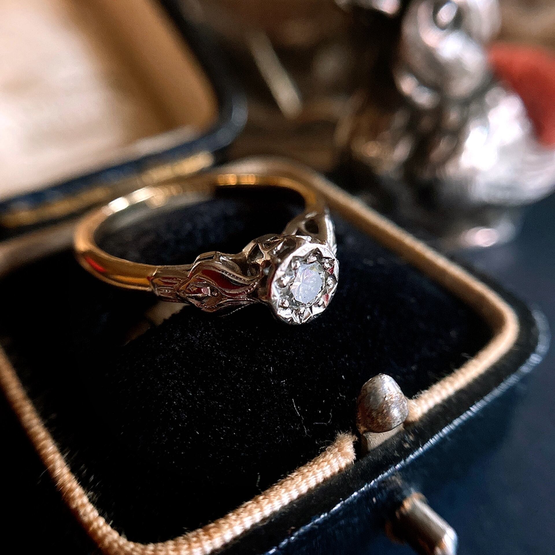 星の輝きを表現したかのような8つにのびる光線を彫金したプラチナの台座の中にすっぽりとひとかけらの星のようにオールドヨーロピアンカットダイヤモンドをセットした美しいアールデコのソリテールリング。