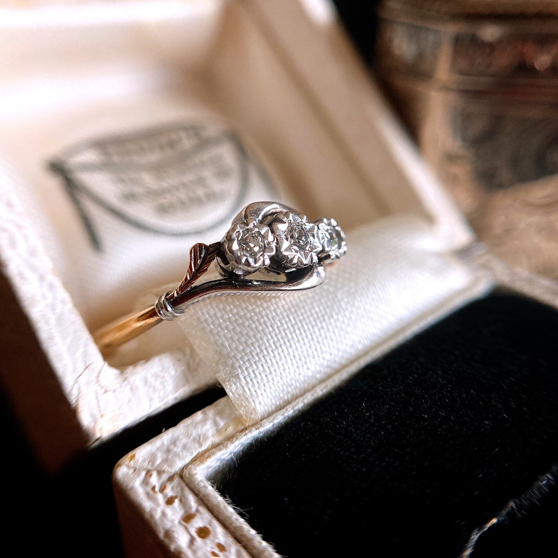 とてもスリムで柔らかに流れる18kゴールドのシャンクから伸びるようにショルダー部分は二手に分かれ、その穏やかな流れのラインに包まれるように小さな3粒のシングルカットダイヤモンドが、幾何学的でシャープな彫金のお花型のプラチナの台座にセットされ、斜めに連なるスリーストーンリング。