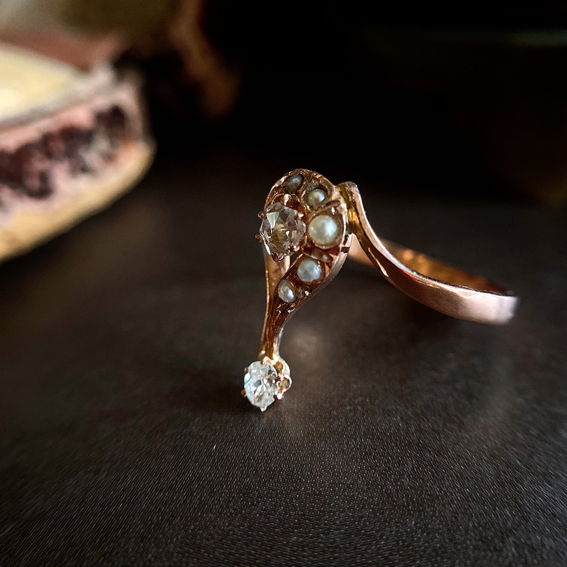さて、こちらのリングはクエスチョンマークをモチーフにハーフパールを5石、メインストーンには2石のダイヤモンドをセットした高級感と遊び心が感じられるひと品です。