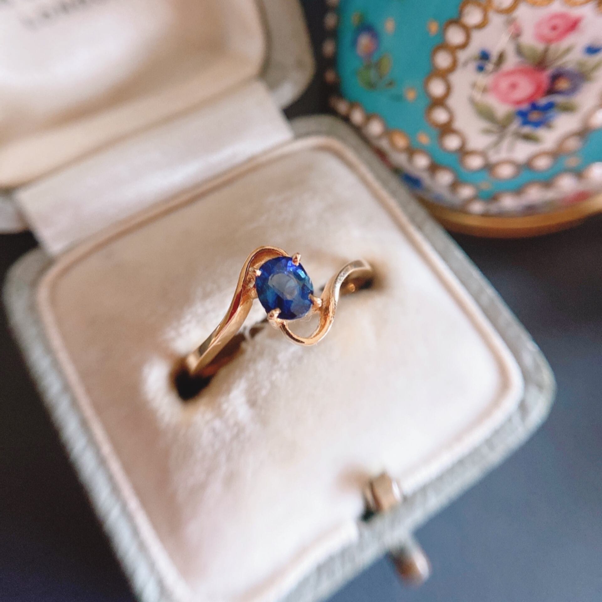 飾り気のないアームの左右から中心に向けてのびる渦巻のような柔らかな曲線に包み込まれるようにセットされたサファイアの高貴な雰囲気は、たとえ小さくても"私を見て!"と言わんばかり訴えてかけてくる美しさがあります。