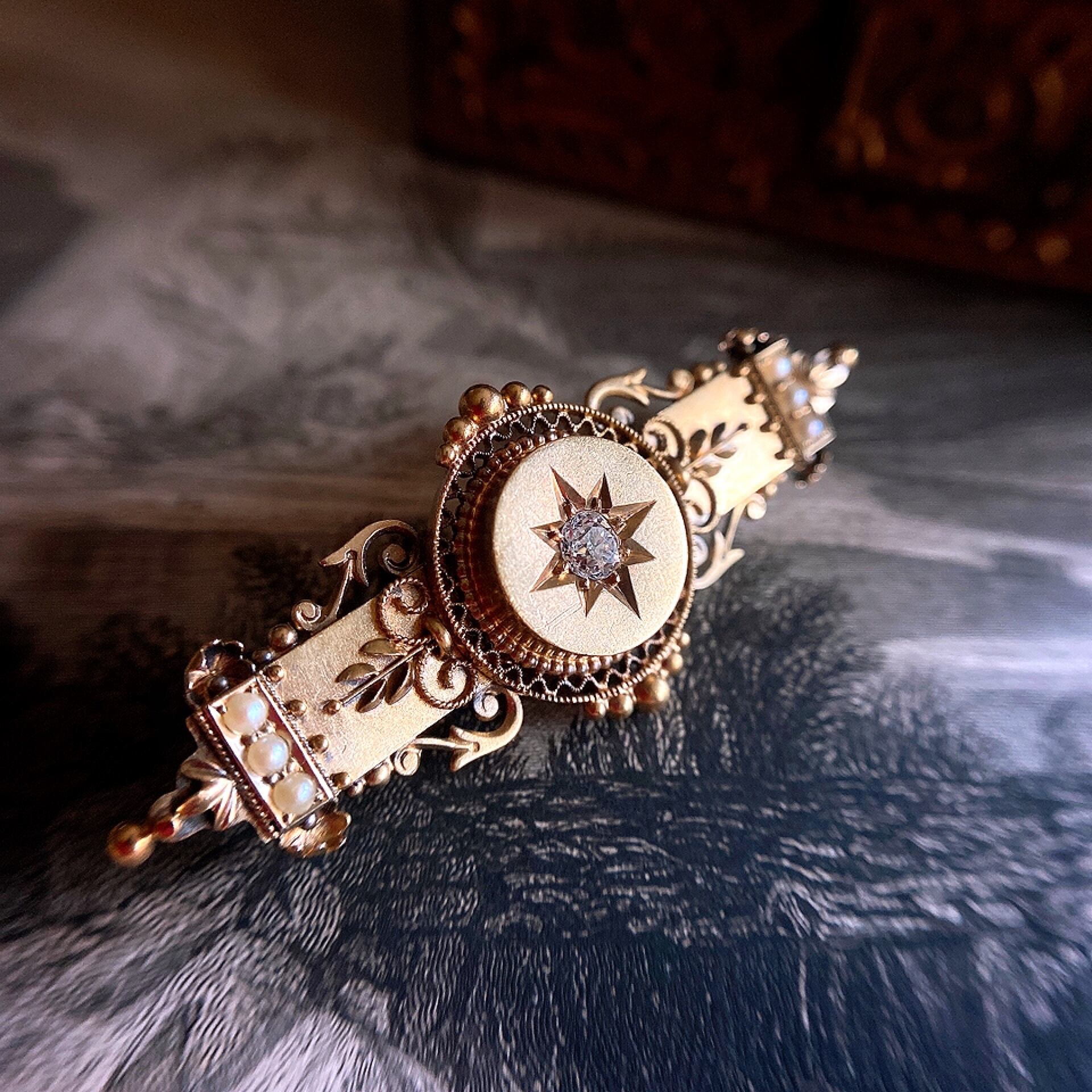 ダイヤモンドの静かな存在も美しく、オールドヨーロピアンカットダイヤモンドのアンティークらしい輝きを放ちます。