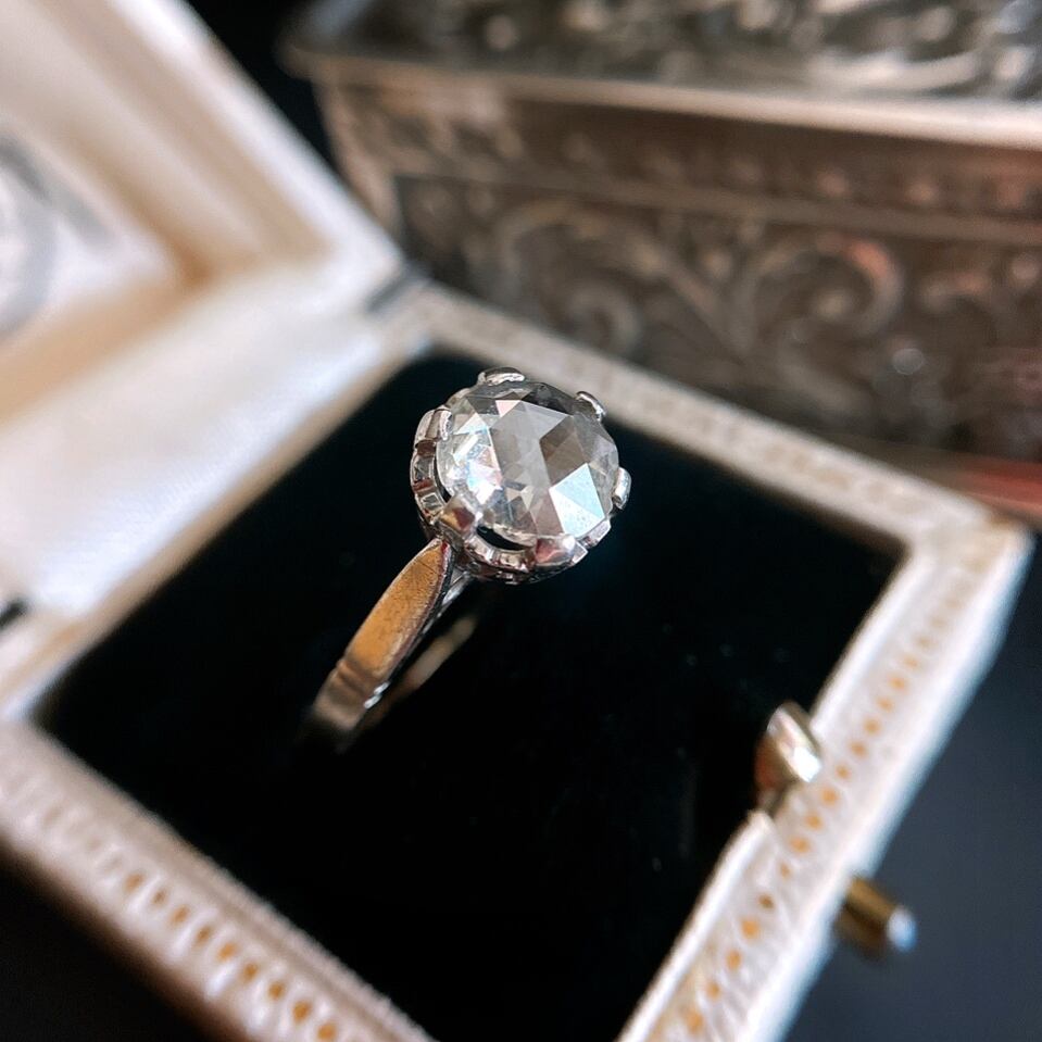 プラチナの王冠のような台座にセットされた7.2mm程の大粒でまん丸のフルローズカットダイヤモンド。