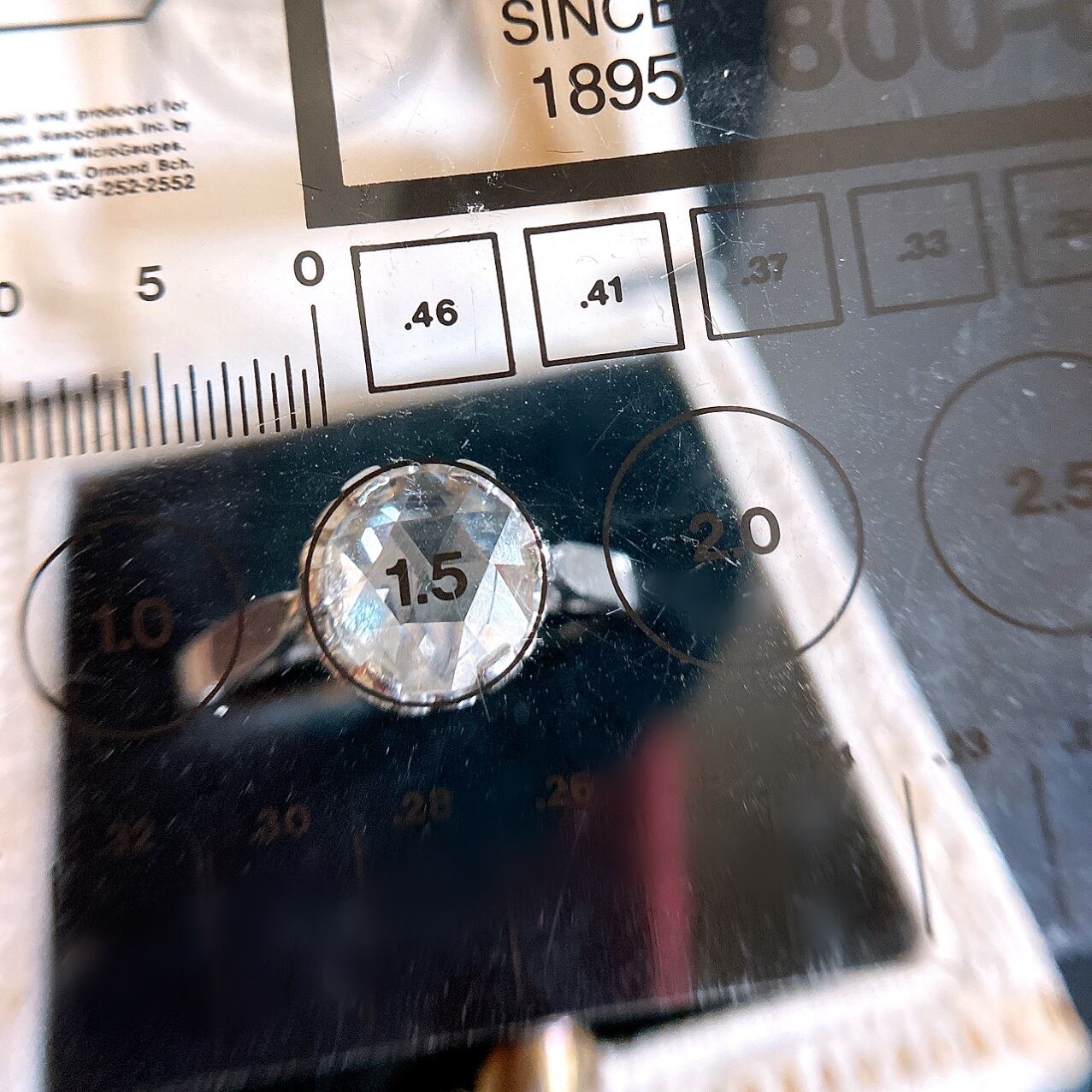 ローズカットダイヤモンドは裏面が平らな為、通常のダイヤモンドと同様のカラット数では測れませんが、通常のダイヤモンドですと1.35ctの大きさになります。