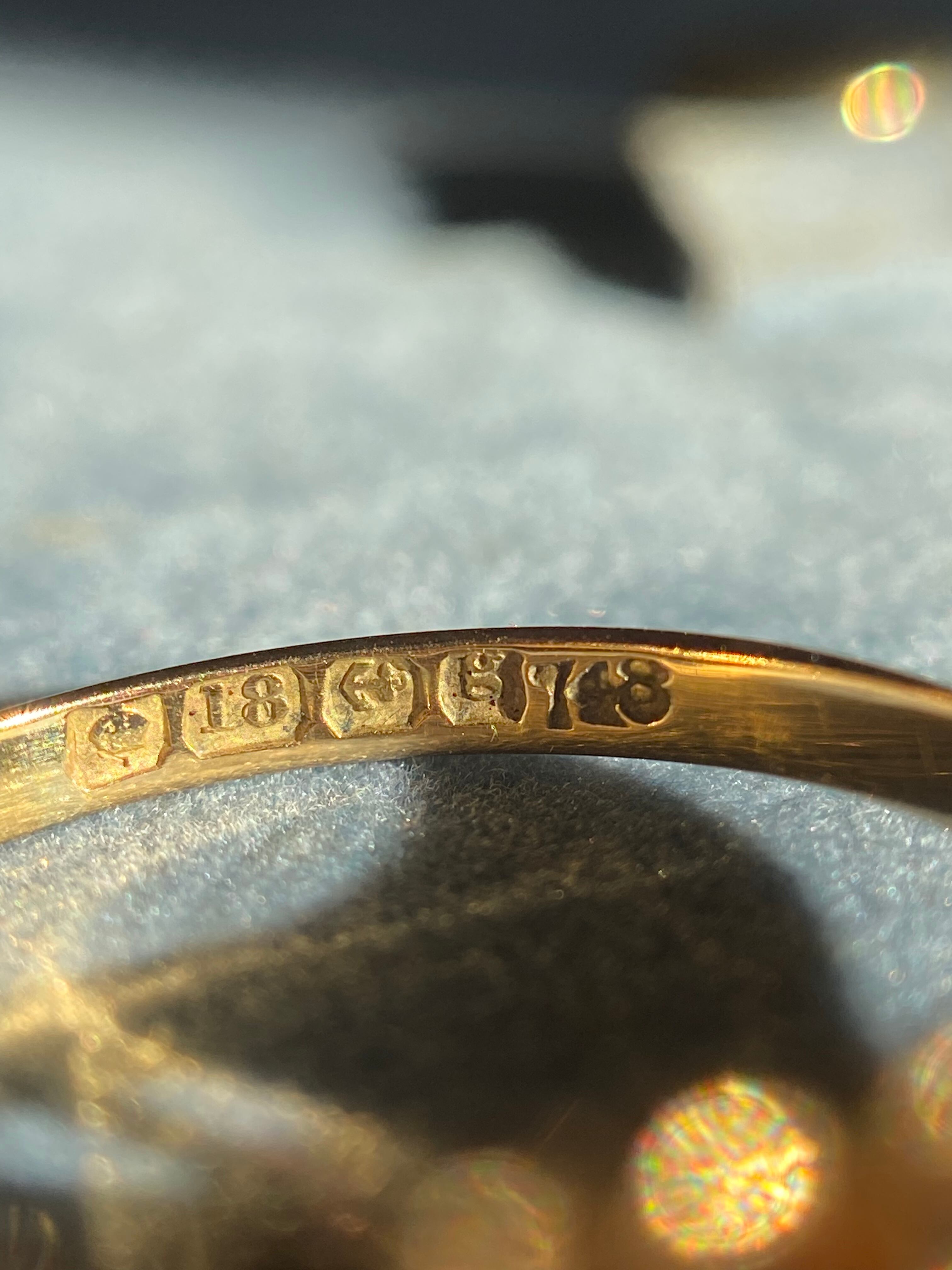 セットし、合間にはシングルカットダイヤモンドを挟んで、イエローゴールドのコクのある輝きにより一層華やかさを添えたエドワーディアンらしいリングのご紹介です。