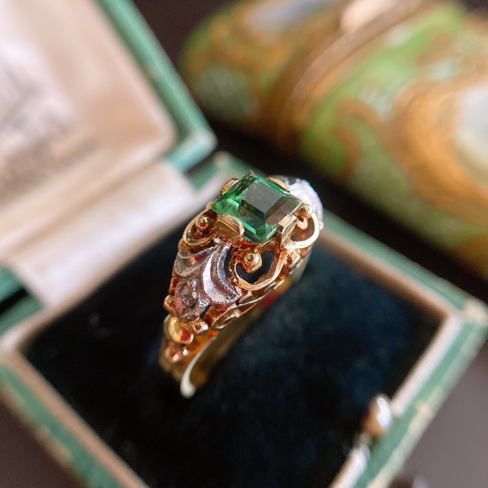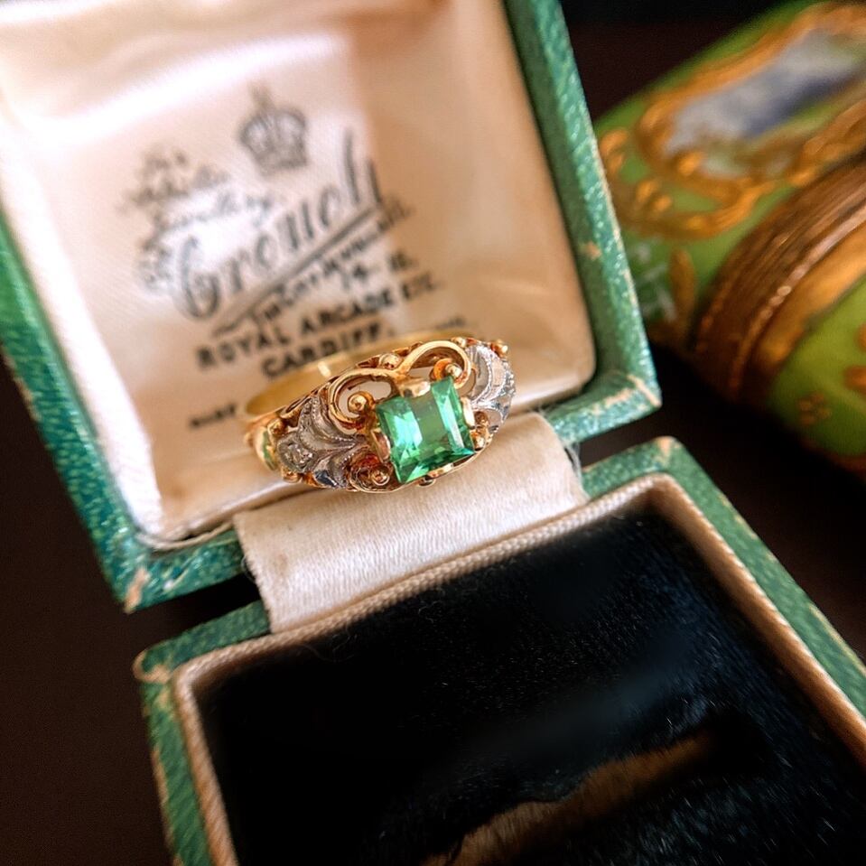 鮮やかながらも落ち着きを感じさせる深みのあるグリーン、そしてナポレオン三世様式の華やかで力強いデザインで他にはない魅力をはなった本当に美しいリングです。(刻印はおそらく過去のサイズ直しで消えてしまったと思われます。が、スタイル的に高さのある台座のセッティングや、ショルダーと一体化したフレームなど第二帝政期ナポレオン三世時代の特徴が出ています。)