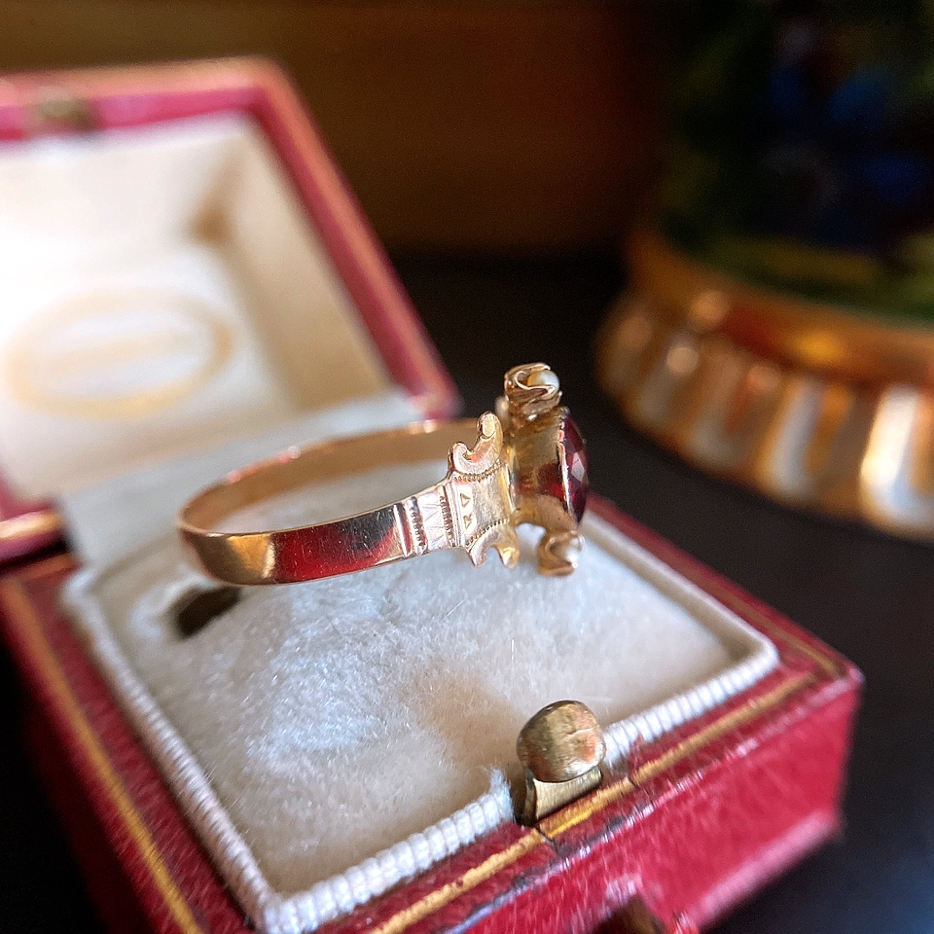 台座に埋め込まれるように丸くコロンとセットされたガーネットのシルエットは可愛らしく、その上下には小さな小さなシードパールが小さな小さなツメにちょこんとセットされています。