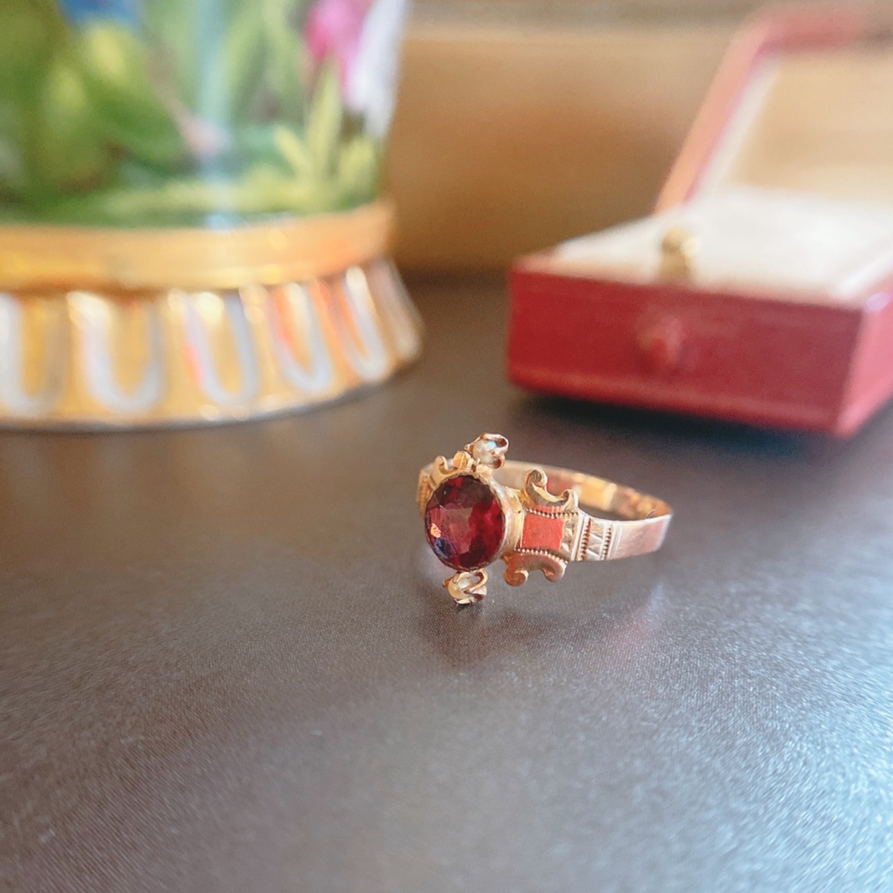 透明感のあるロゼワインのようなカラーが美しいロードライトガーネットのヴィクトリアンリングのご紹介です。