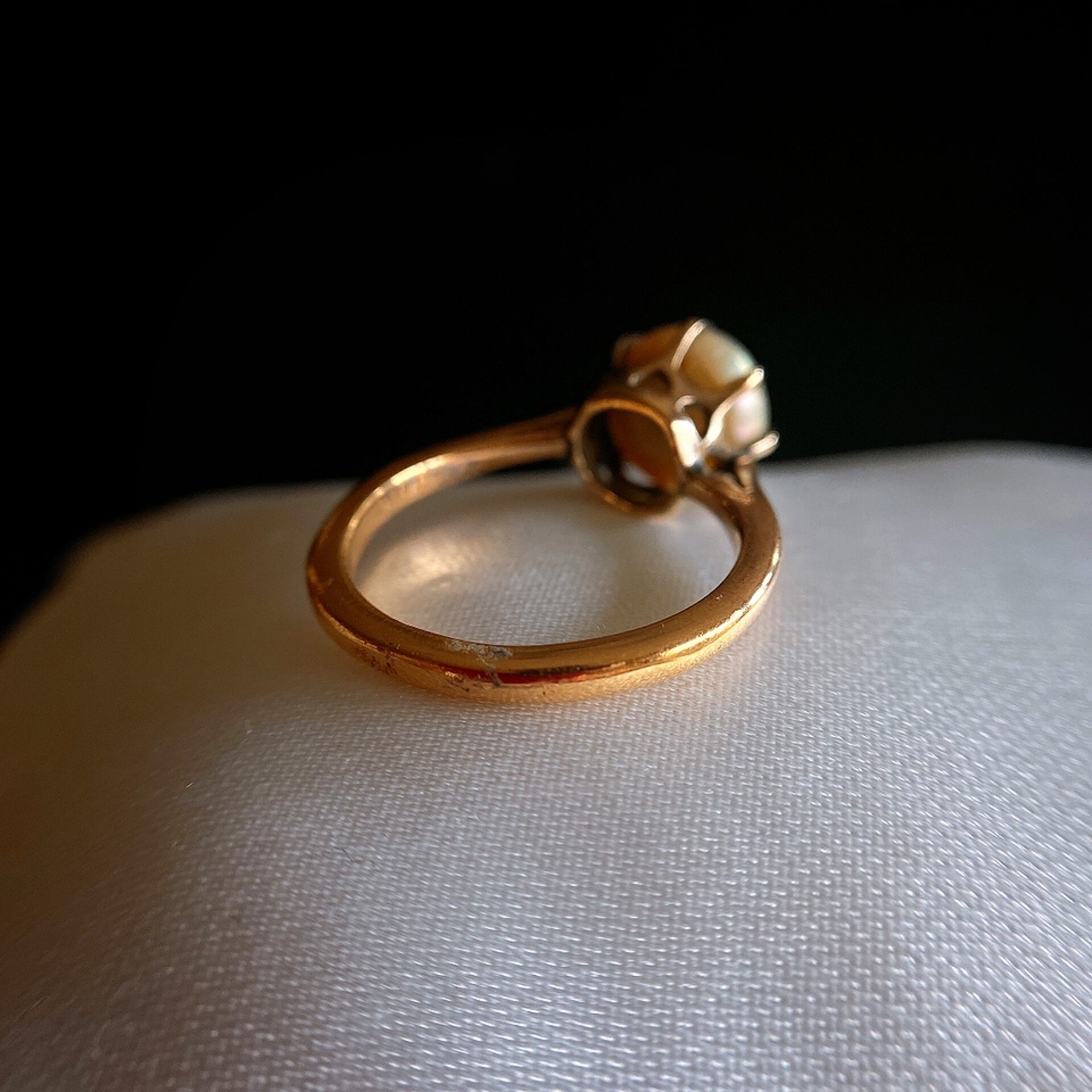 王冠の台座に堂々とセットされた風格たるや、こっくりとしたローズゴールドの地金と混ざり合い、余計な装飾がないからこそ、真珠の美しさが一層引き立ちます。