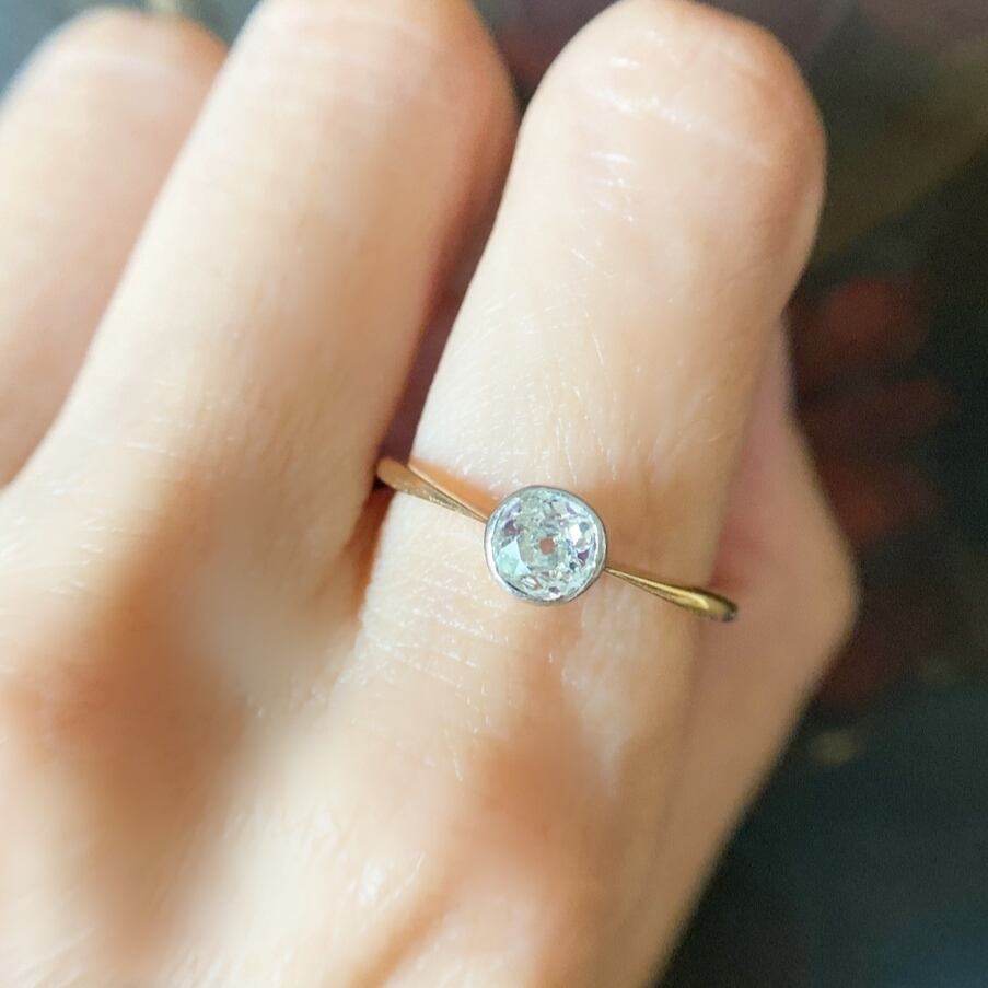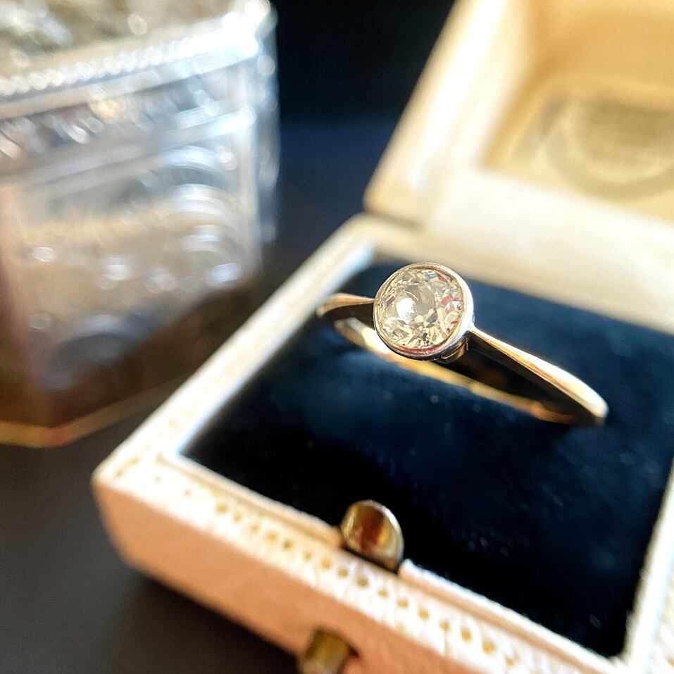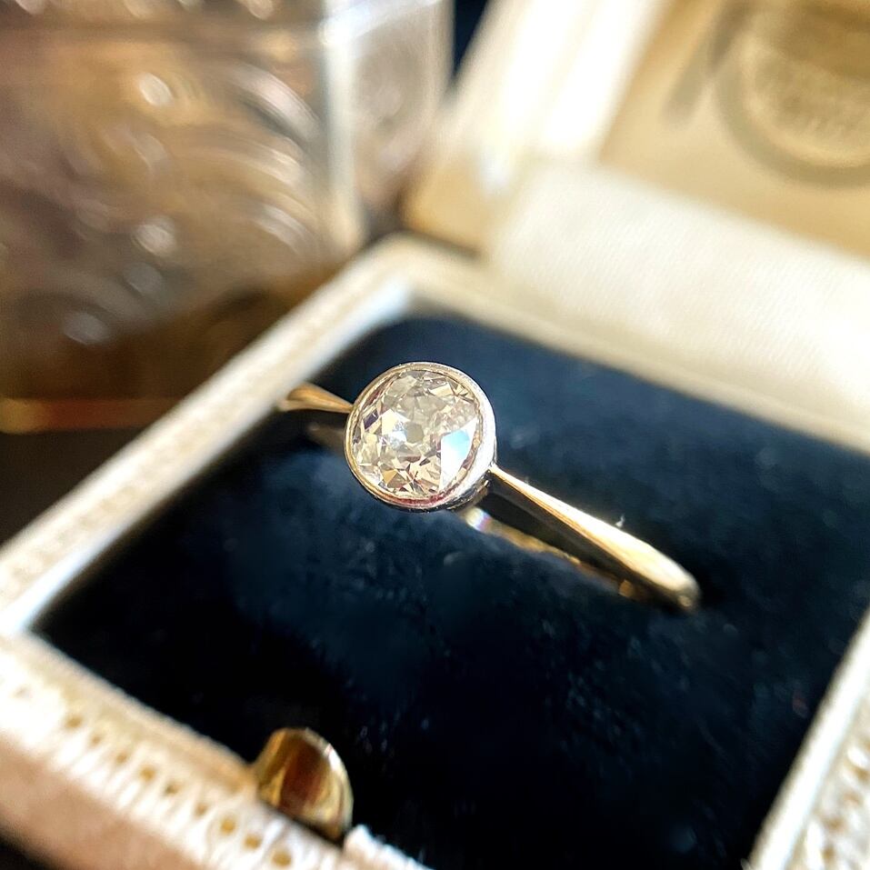 ダイヤモンドは台座にすっぽりと包まれるようにコレットセットにされているため、たて爪リングと違い大きさが小さく見えがちですが、写真にもありますように大きさは約0.5ctあり、オールドカットダイヤモンドとしてはそれなりのサイズです。それなりの存在感がありますが、これ見よがしの輝きではないので、心地よくコーデを楽しんでいただけるひと品です。
