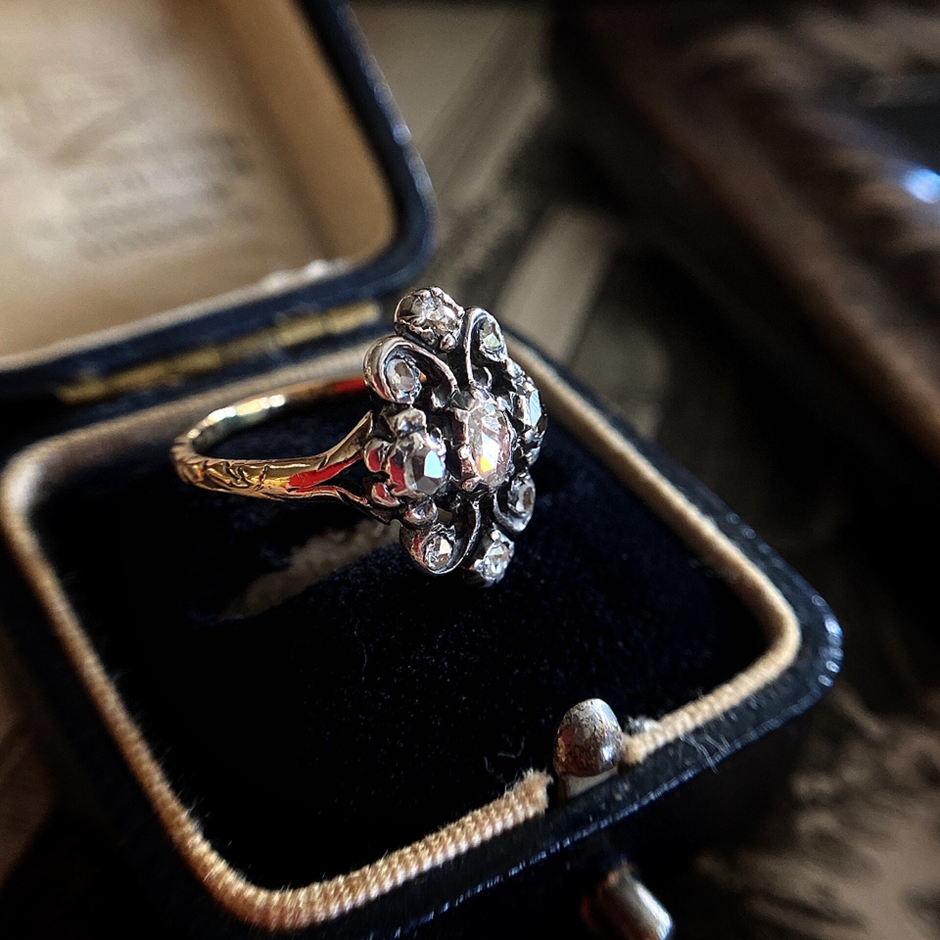 150年以上前のものと思うと今のジュエリーでは決して味わう事のできないダイヤモンドの輝きと全体の侘び寂びの雰囲気は格別です。