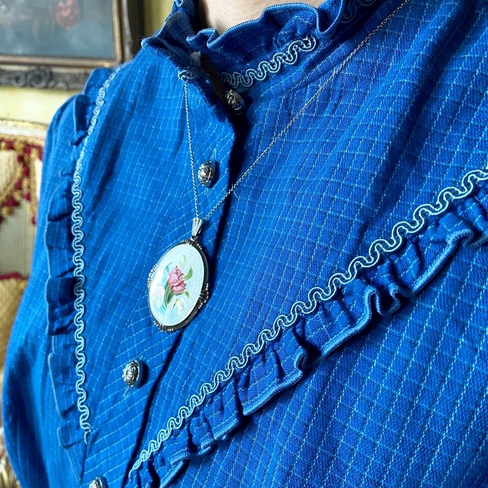ピンクと緑のグラデーションが美しいチューリップを中央にその周りに白の小波のようなギロッシュエナメルをかける事でチューリップが強調され、また白を強調させるように柔らかなスカイブルーが水面ように全てを包みこんでくれているような優しさが伝わってくるノルウェーからのペンダントのご紹介です。