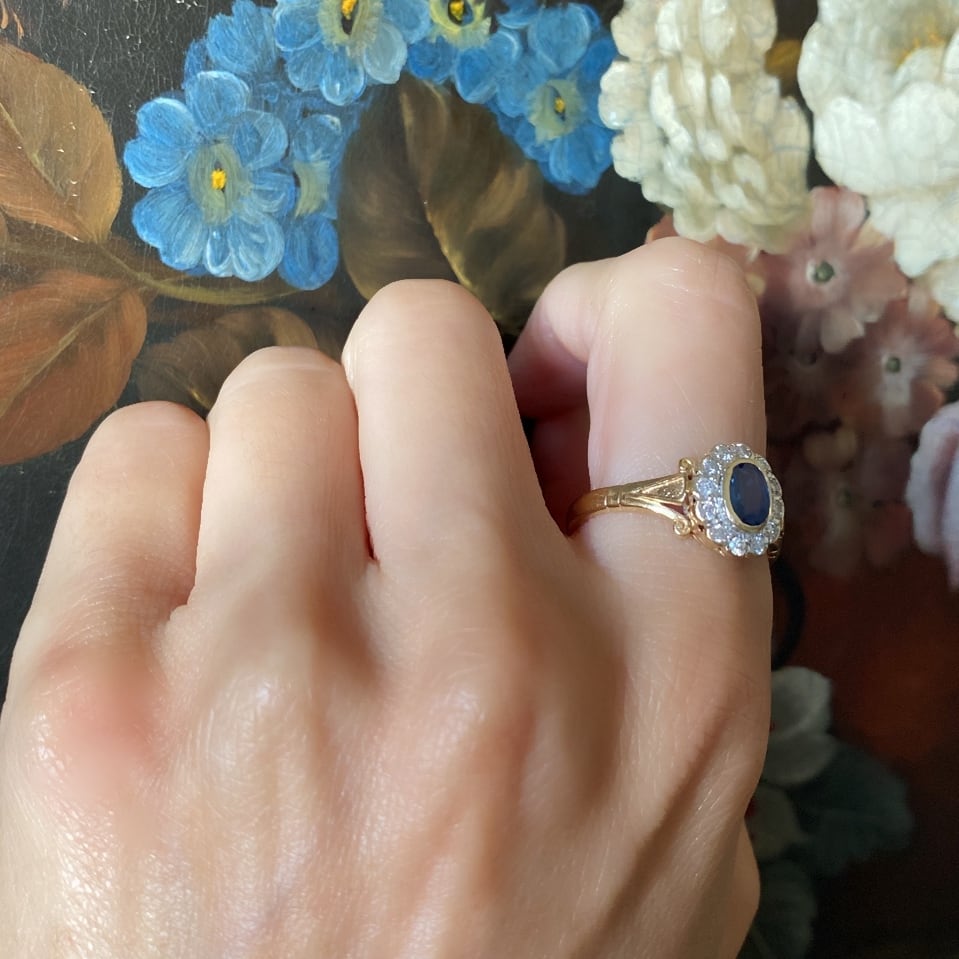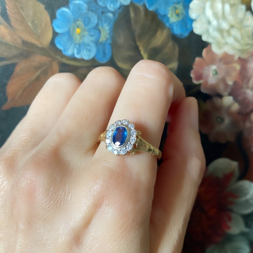 ロイヤルブルー色の濃密な"青"の底から、光にかざすとまるで地中海の海を思わすブルーがチラチラと輝き、取り巻きのダイヤモンドに引き立てられるようにして、美しい姿を見せてくれるフラワークラスターリングのご紹介です。