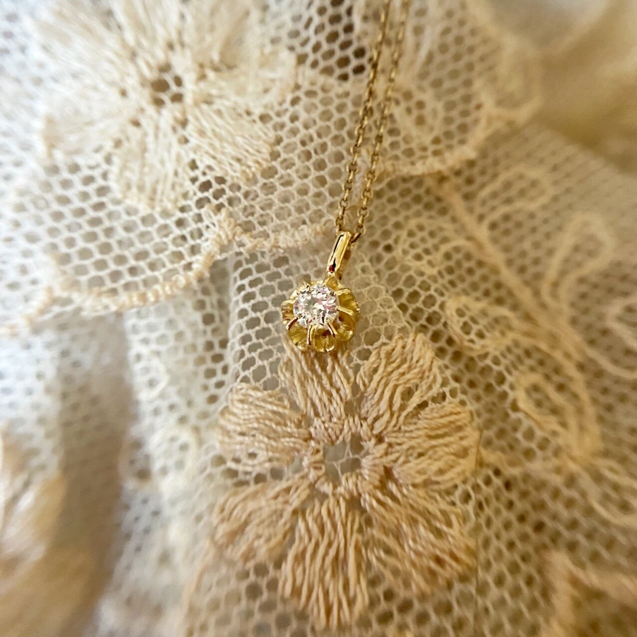 正面から見た時に花びらのように可愛らしく、そよ風になびきそうなまでに柔らかい印象があります。しかし触れてみれば、それは硬いゴールド。その硬いゴールドで柔らかさを表現した可愛らしい小さな小さなペンダントは普段使いにぴったり。