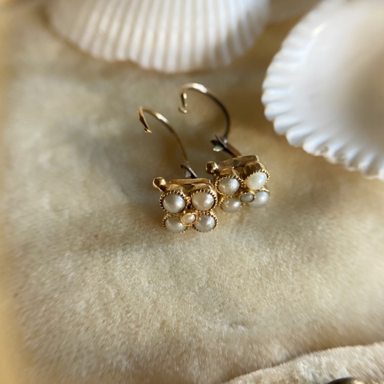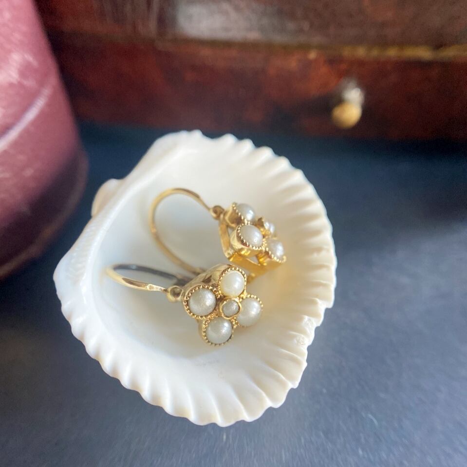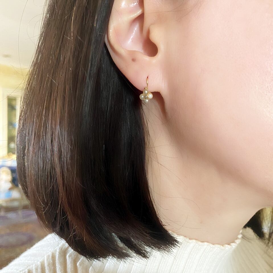 真珠がまだ今の様に溢れていなかった時代に集めた5粒のパールのアンティークならではの色味の違いをうっすらと感じる、辿ってきた分だけの深みある表情が魅力的なフレンチドルムーズピアスのご紹介です。