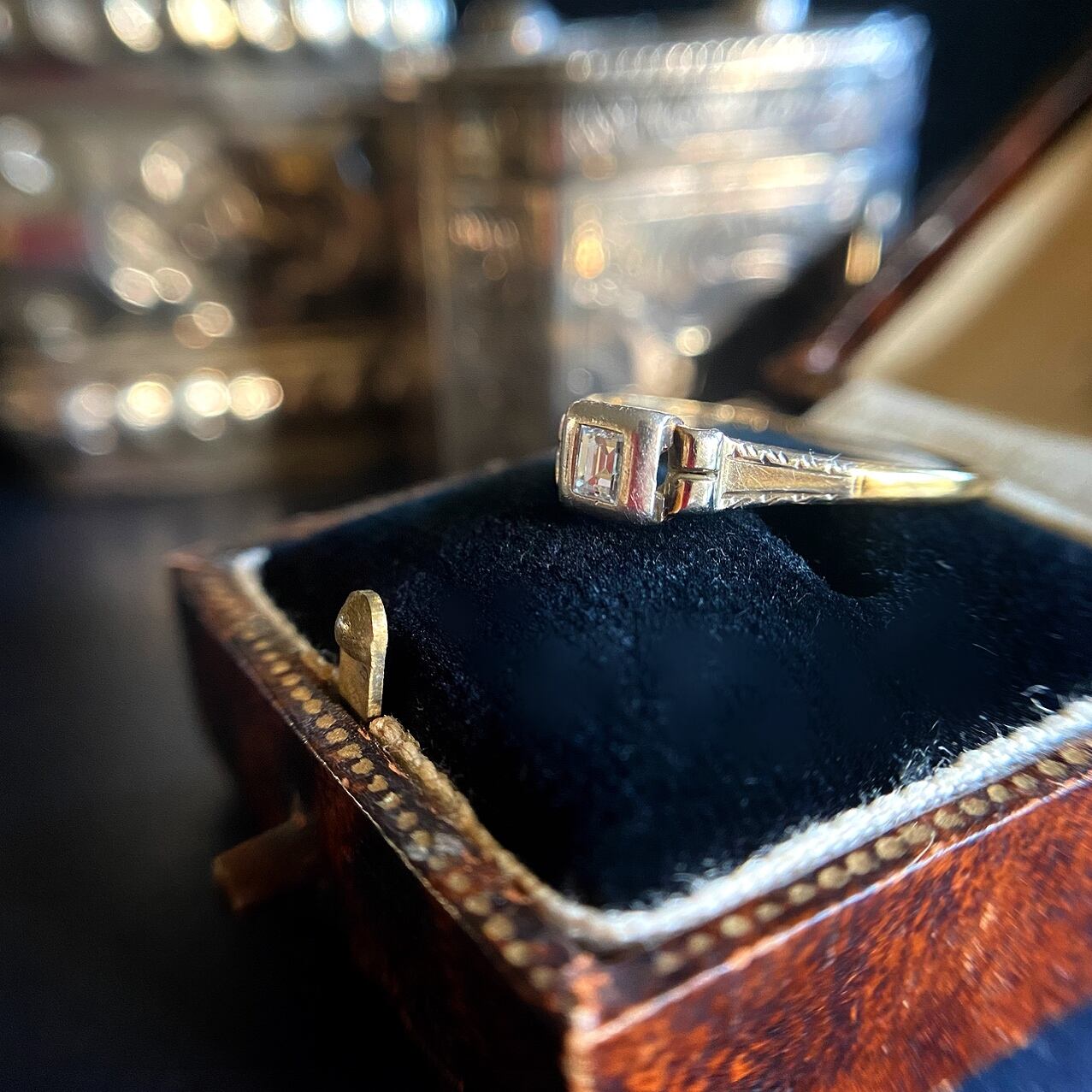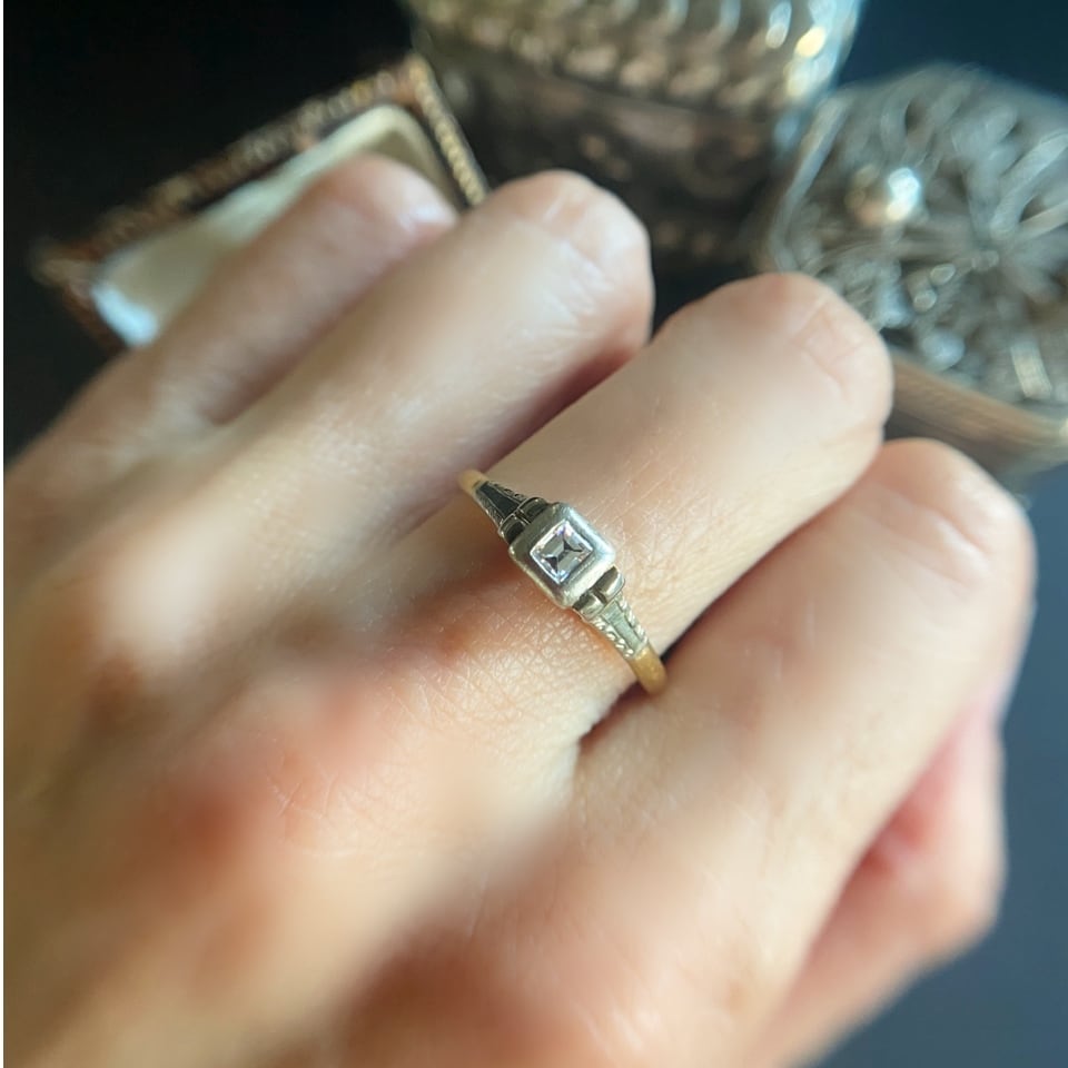 アールデコのプラチナのクールな台座にセットされた氷のようにシャープな印象がカッコいい小さなバケットカットダイヤモンド。