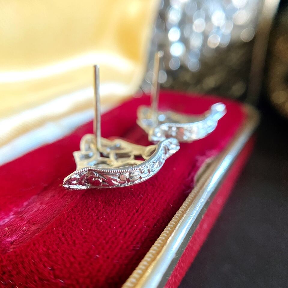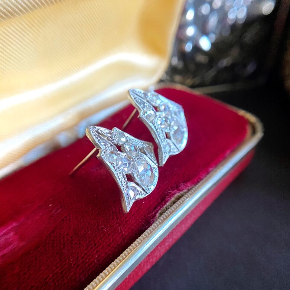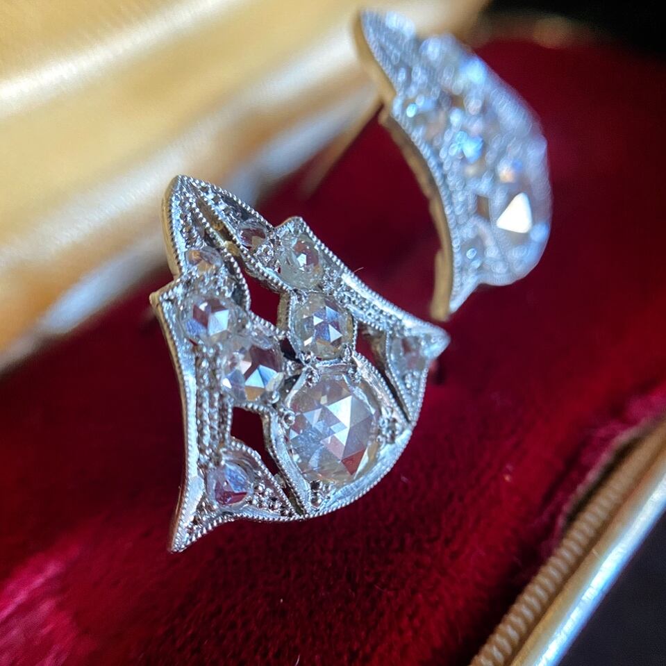 「小さな鐘」を意味するカンパニュラという花、風鈴のようにふっくらとした形と優しい色合いが魅力な花ですが、そんな花を連想させる、ローズカットダイヤモンドが散りばめられたとっておきのアールデコピアスのご紹介です。