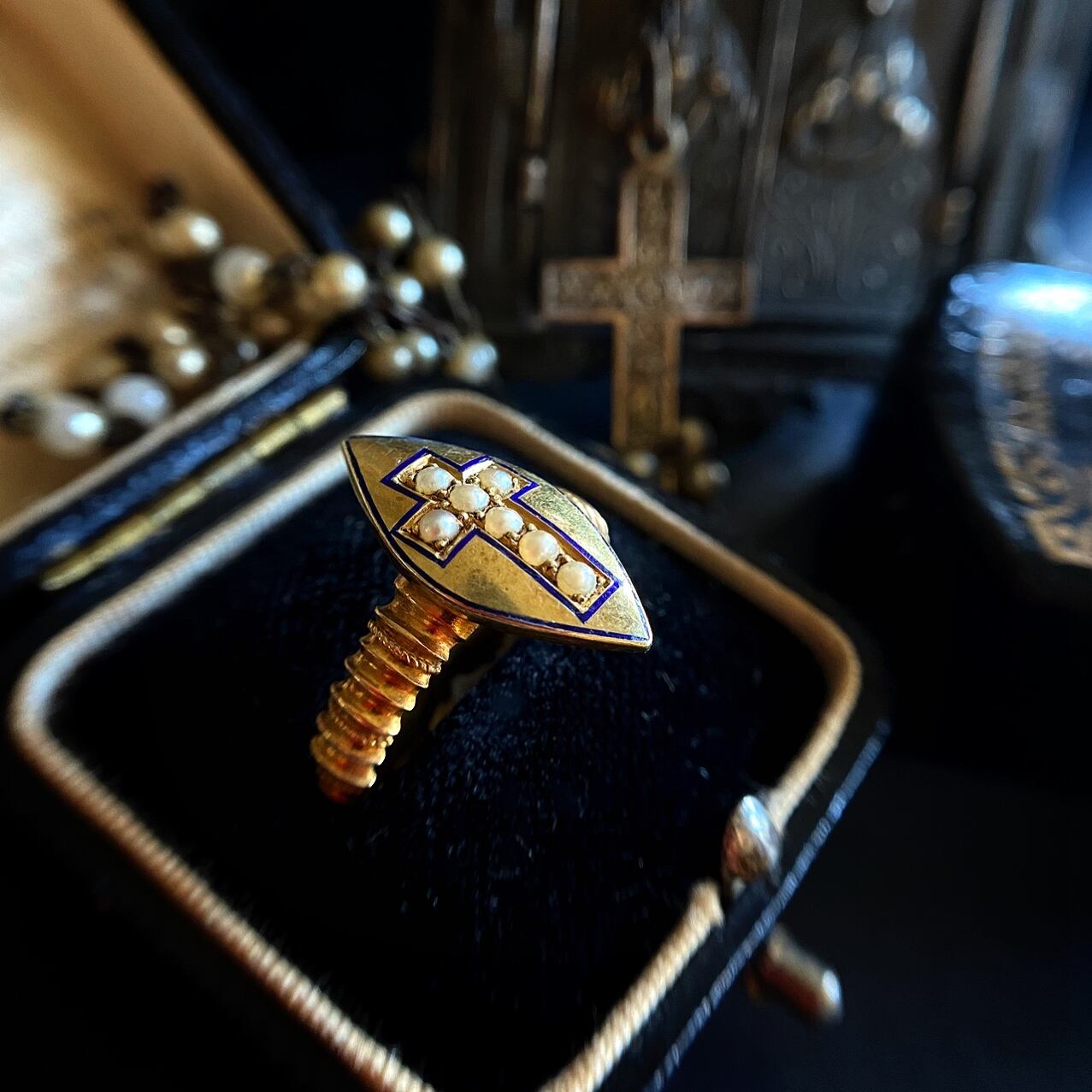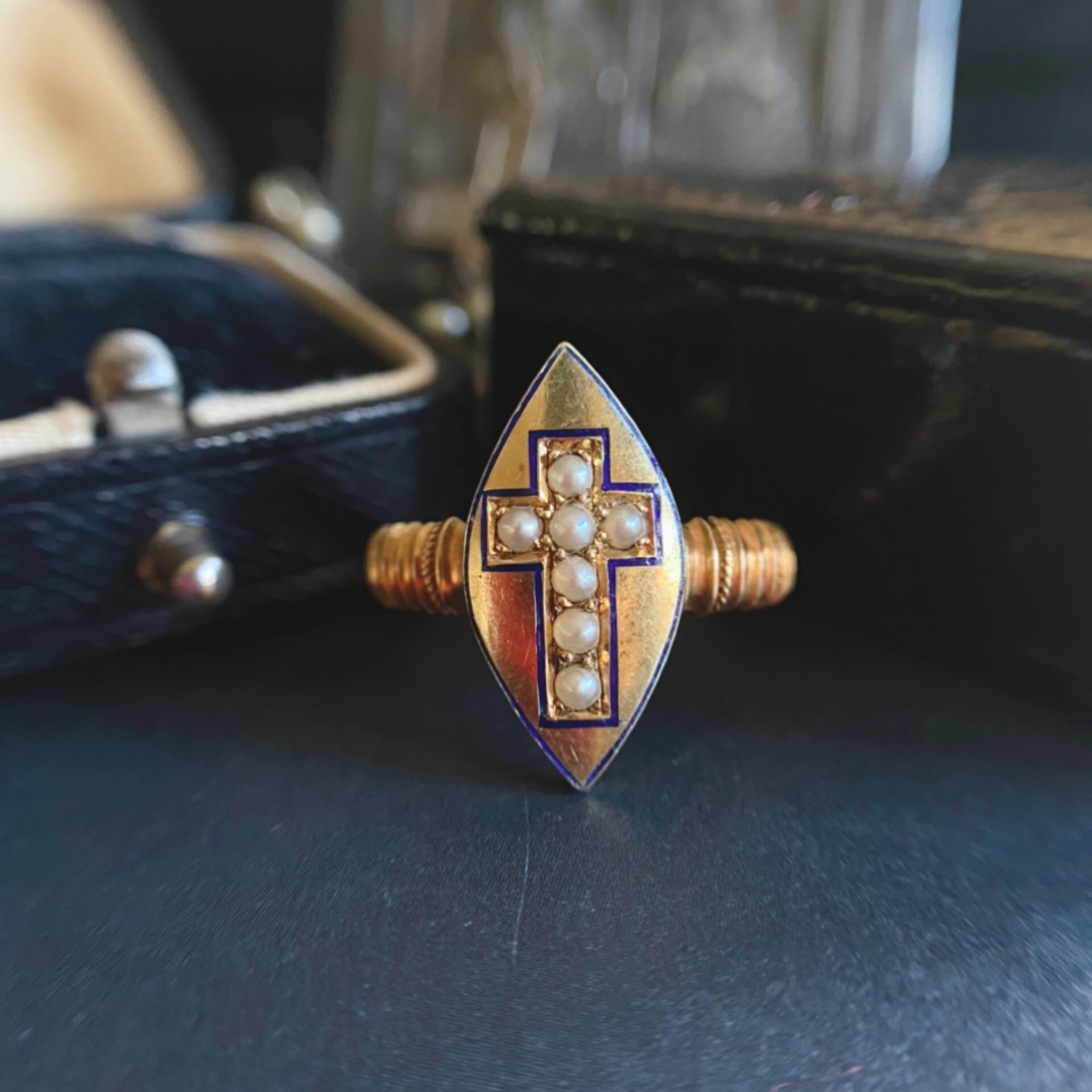 金台に黒やロイヤルブルーのエナメル、オニキスやジェットなどの漆黒の石、縁取りにはパールが使われ、