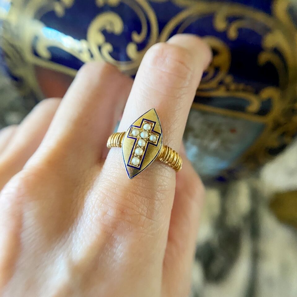 ナチュラルパールクロスデザインマーキーズシェープのヴィクトリアンリング