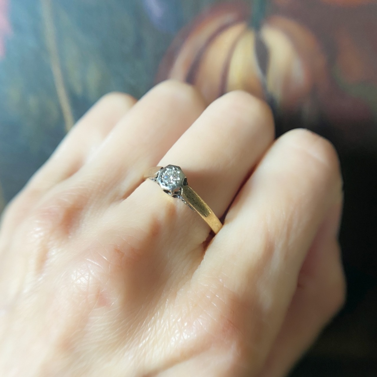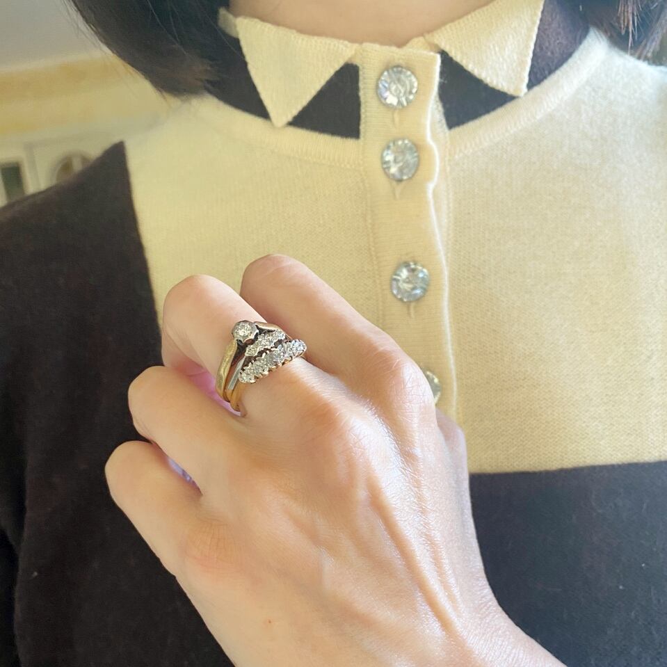 ダイヤモンドはプラチナの台座に深くセットされ、マットな光沢が美しいゴールドのアーム、シンプルな中にも今のリングでは決して味わう事の出来ない人の手のぬくもりと、過ぎた月日の時間の深みが宿った、私にはどこかのどかで美しく感じるリングです。