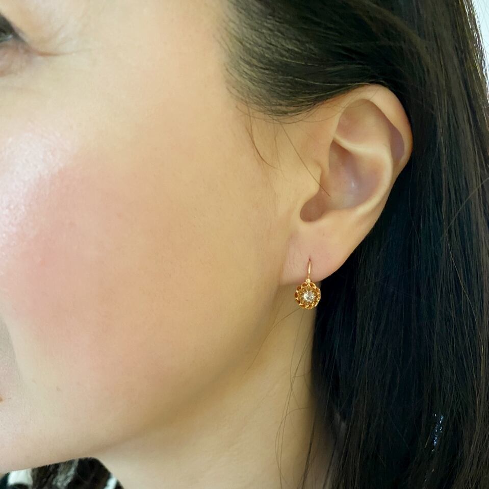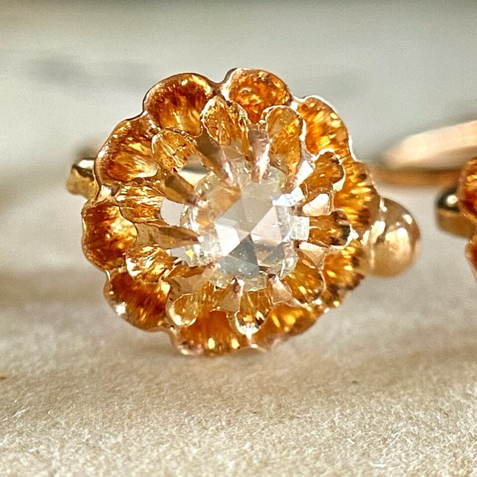 バターカップセッティングは19世紀末から20世紀初頭のターンオブザセンチュリーにイギリスやフランスで流行したセッティングで、クラシカルな美しさと嫌味のない華奢なサイズ感は現代のファッションともよく合う為人気が高く、デイリーピアスとして活躍する事間違えなしです。