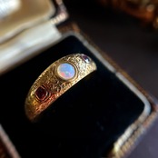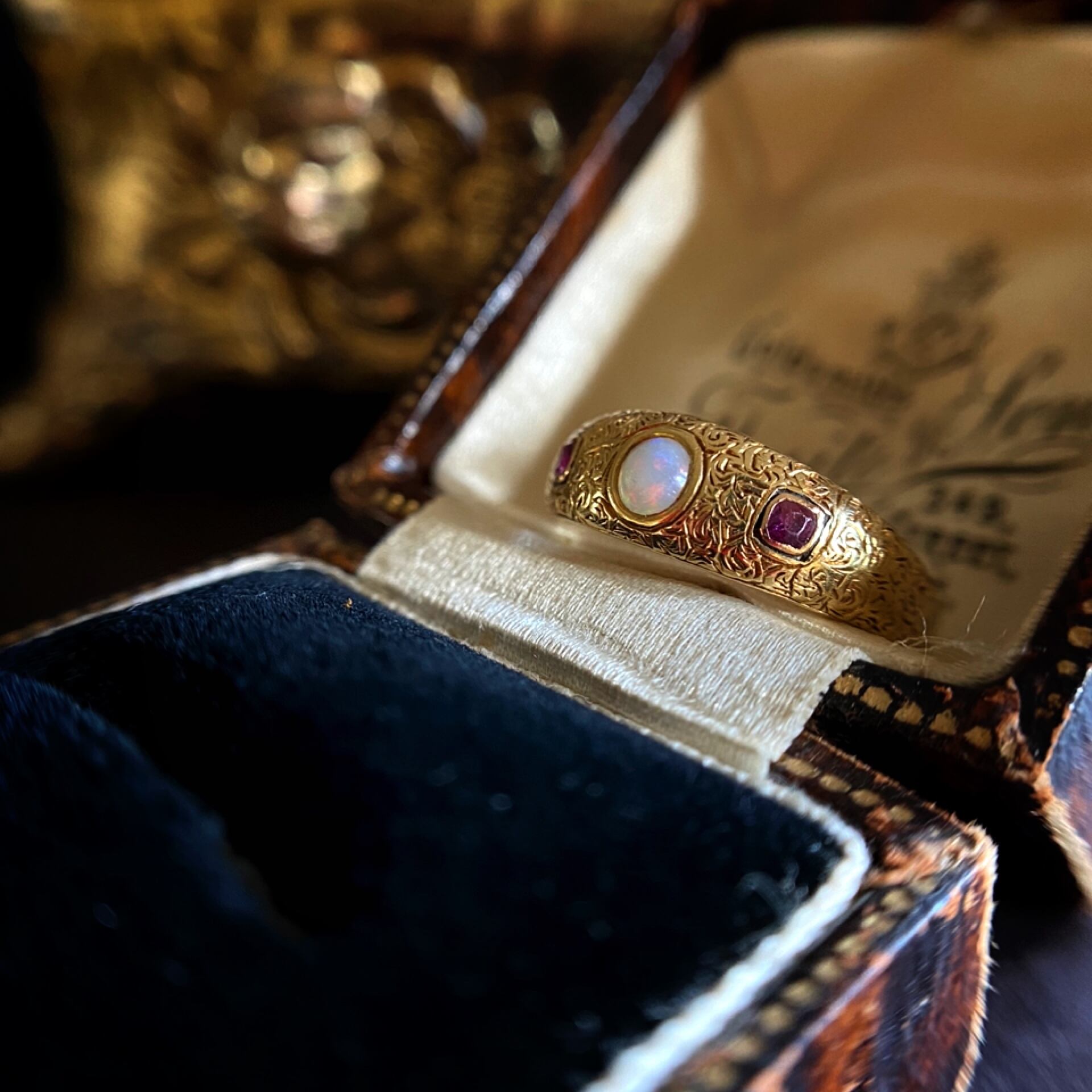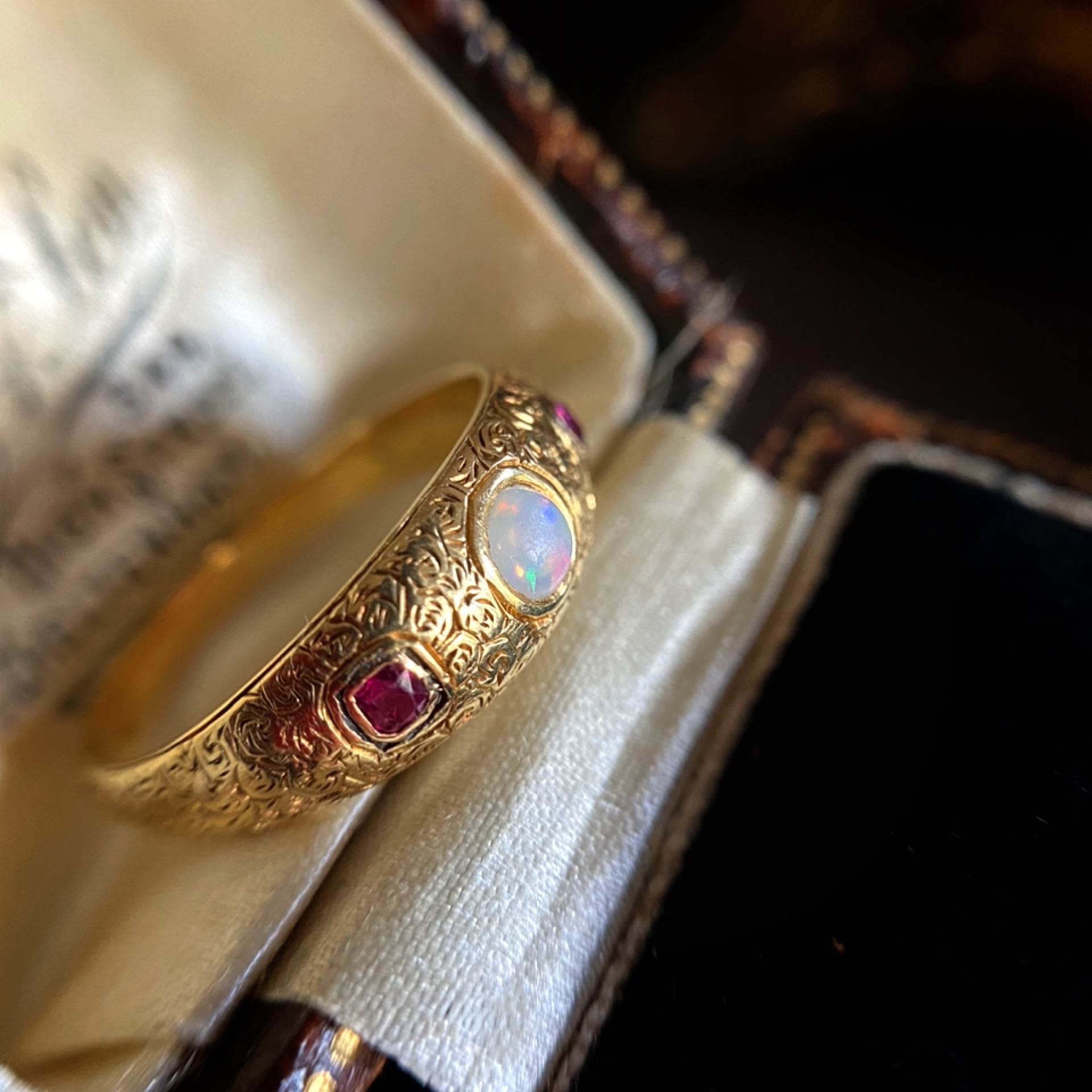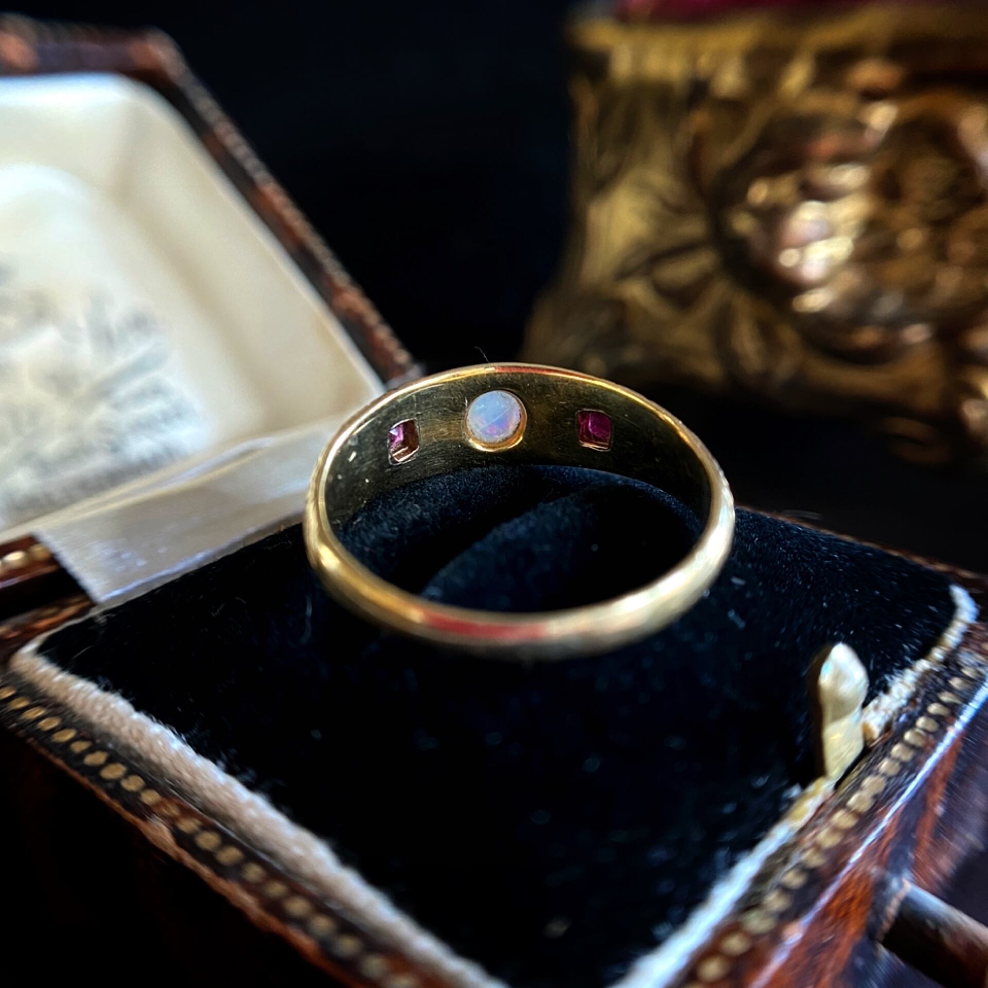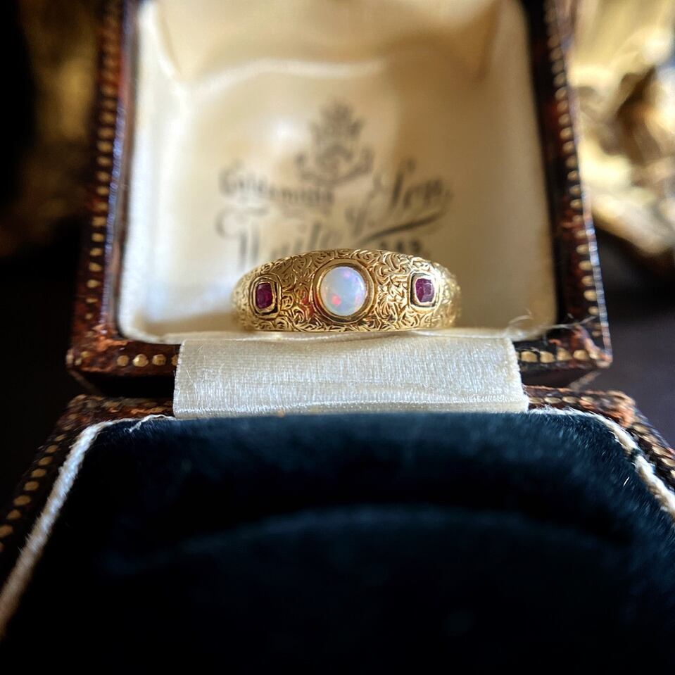 まん丸とカボッションカットされた乳白色の石の中に、ブルーやグリーンがふとした時に垣間見え、その幻想的な雰囲気のオパールを中心にすっぽりとセットし、その左右にはクッションカットされたルビーがアクセントとなった、魅力的なひと品です。