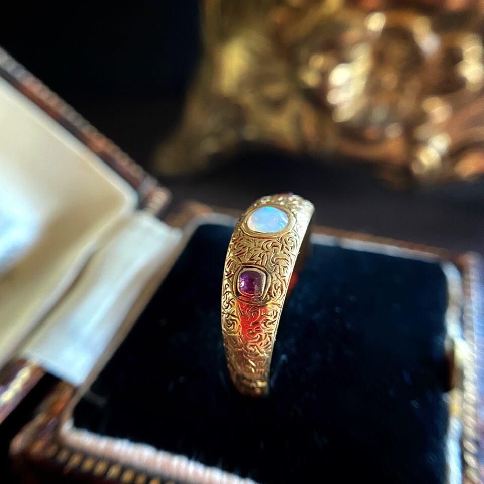 野薔薇の彫金で埋めつくつされたフェイスに浮かぶ満月のようなオパール、そして薔薇の花びらのような2石のルビーのリング。
