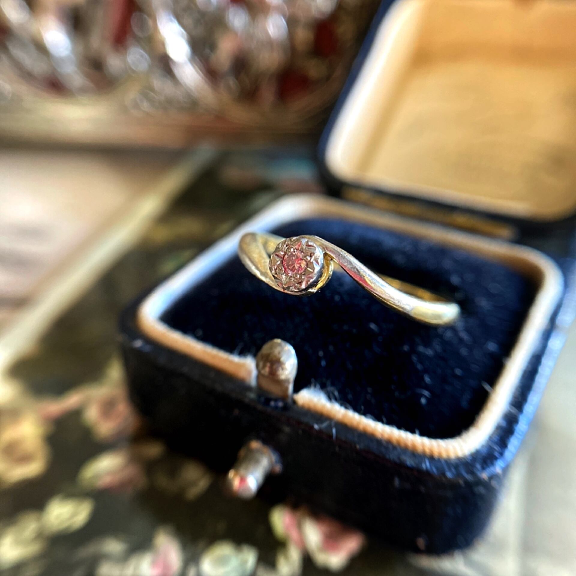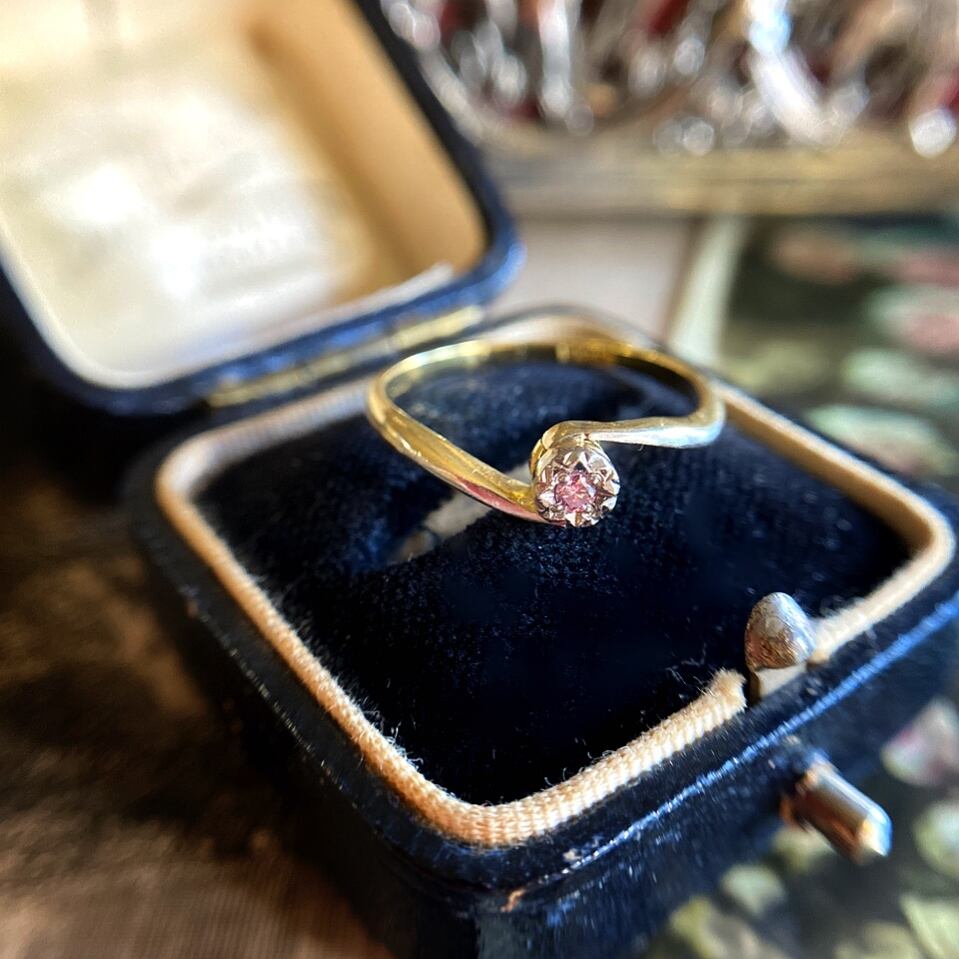 飾り気のないアームの左右から中心に向けてのびる蔦のような柔らかな曲線に包み込まれるようにセットされた小さなピンクダイヤモンドのキュンとくる可愛らしさ。