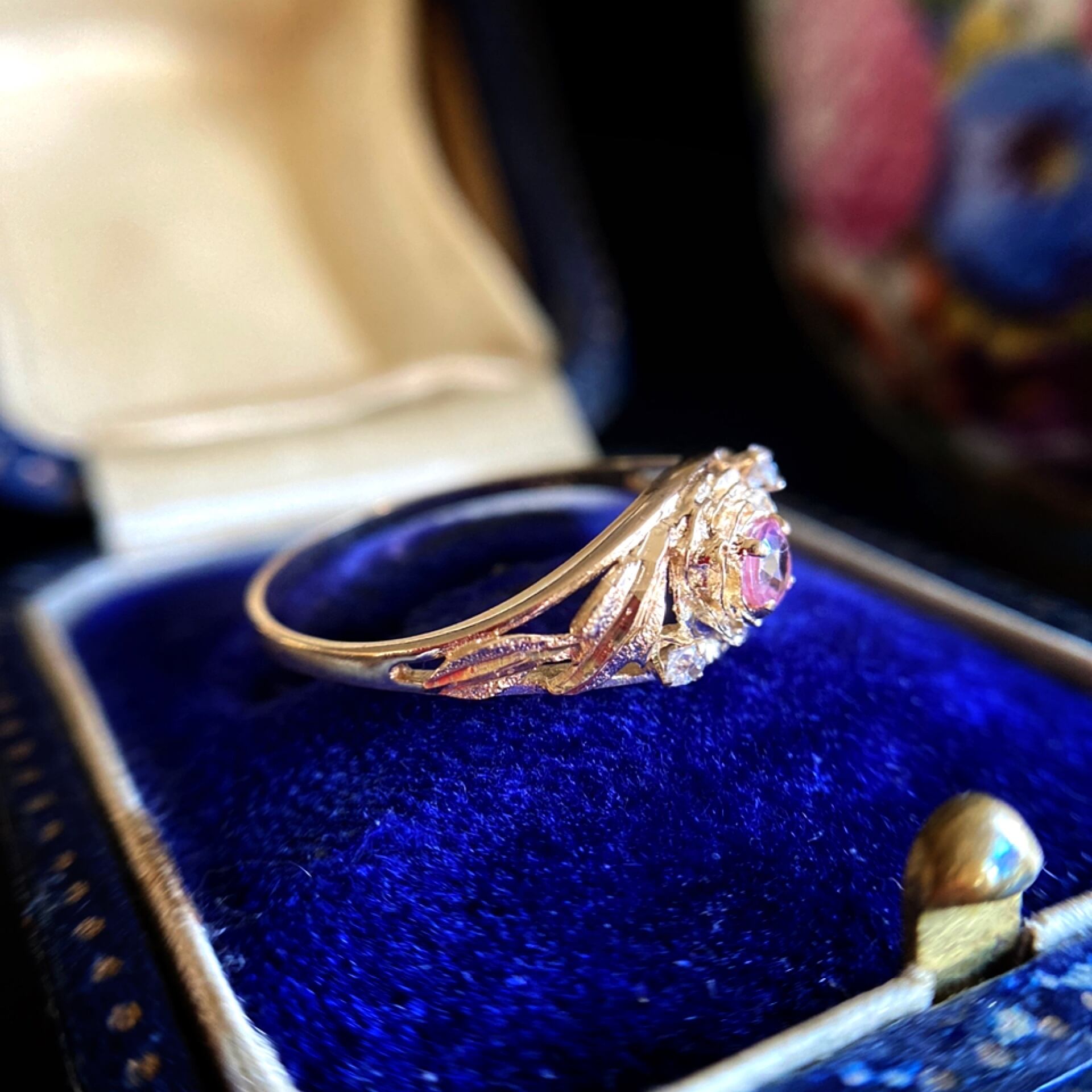 こちらのリングが製作されたアールヌーヴォー期頃は金細工の最盛期であったということもあり、花びらや葉を生き生きと立体的に表現した作品が製作されました。