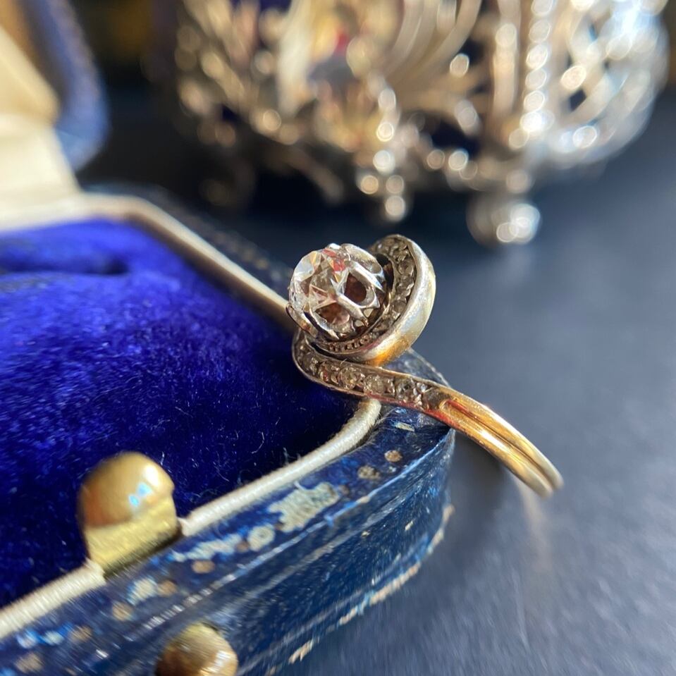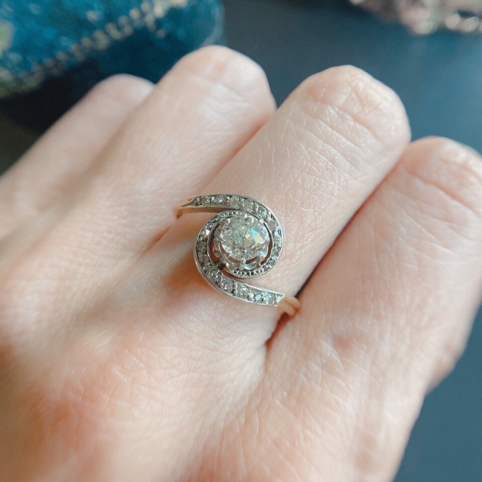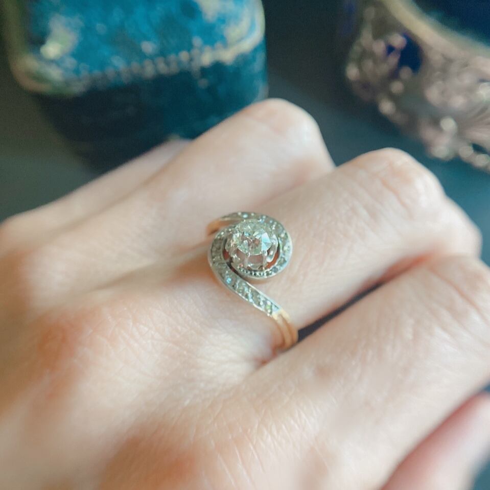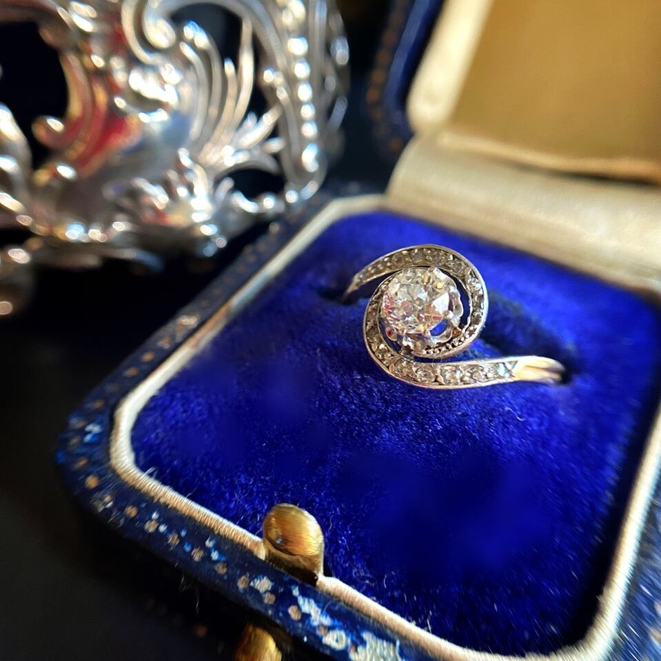 フランスらしいデザインのひとつで、渦巻きの螺旋部分に9石の小さな小さなローズカットダイヤモンド、中央には大振りのオールドヨーロピアンカットダイヤモンドがセットされています。