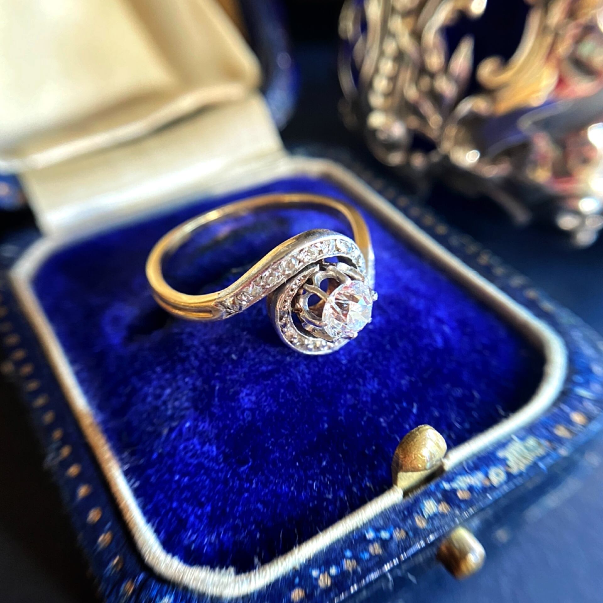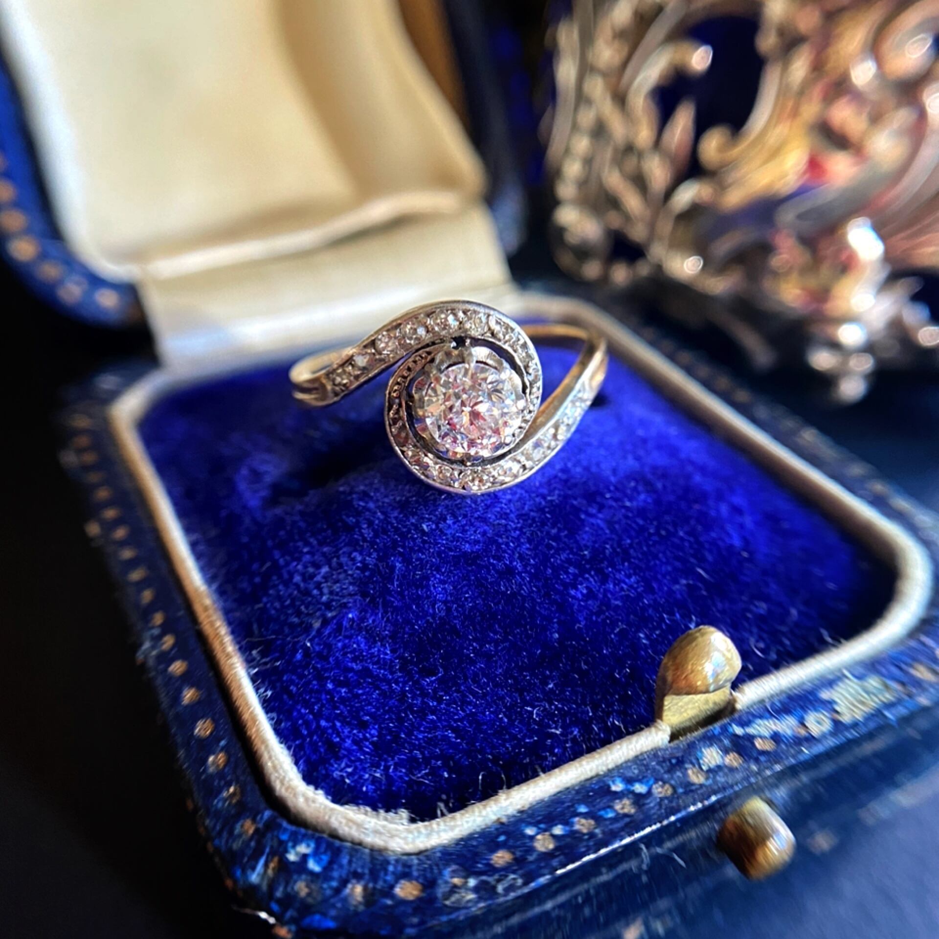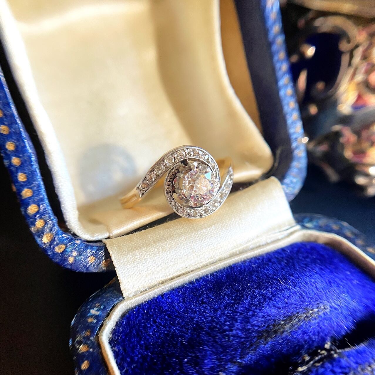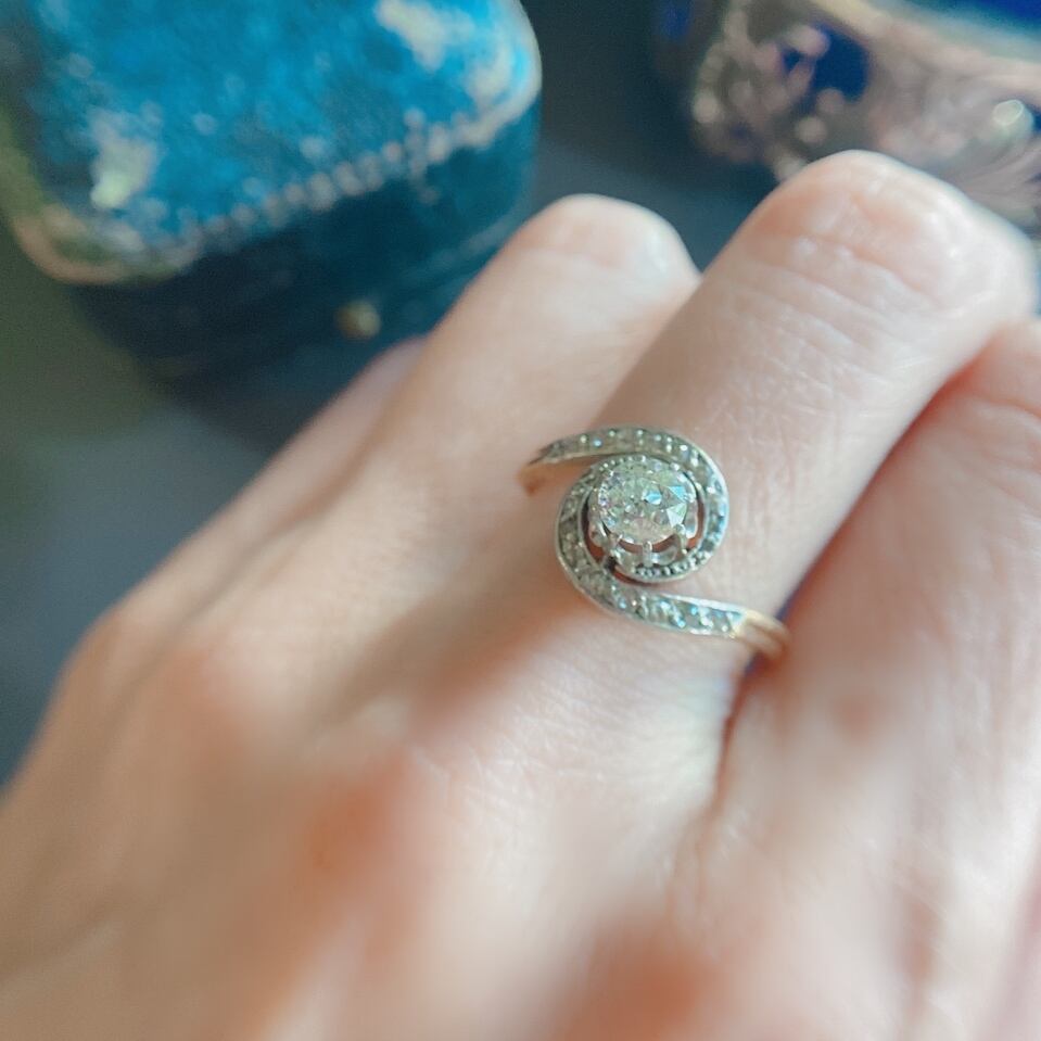 フランスらしいデザインのひとつで、渦巻きの螺旋部分に9石の小さな小さなローズカットダイヤモンド、中央には大振りのオールドヨーロピアンカットダイヤモンドがセットされています。